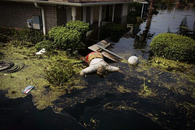 Единственно сухое место в доме - крыша. Из припаркованного рядом автомобиля прет масло и топливо, окрашивая воду. Проблема любого наводнения - воды полно, а пить нечего. Вся вода грязная до безобразия. Кипятить воду или дистиллировать ее американцы разучились.