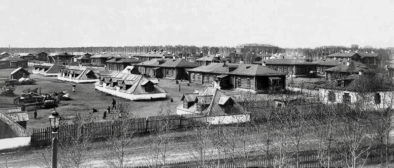 1900-1920 года, Челябинск. Вид переселенческого пункта. 1900 - 1920. Неизвестный автор. Для размещения людей имелось 5 теплых бревенчатых, 11 полутеплых (постройки 1898 года) бараков. В смету 1910 года была внесена постройка барака на 500 человек и больницы на 150 коек. Территория пункта составляла 10 десятин, к ней шла железная дорога. Строительство переселенки вели чиновники Станкевич и Пилкин; большая часть зданий строилась чиновником Архаровым.