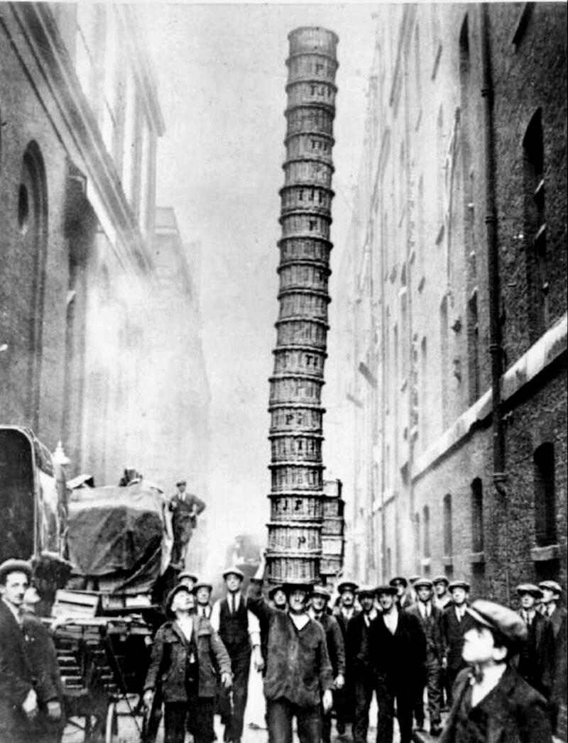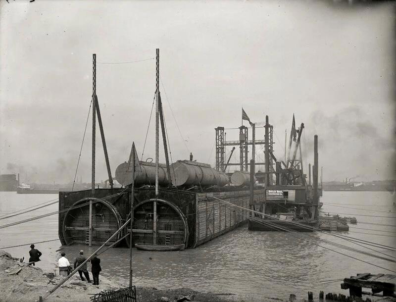 1910 год, США, Детройт. Выгрузка готовой секции тоннеля Мичиганской центральной железнодорожной компании.