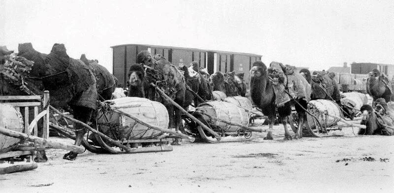 Автор: Homo Vulgaris1892 - 1898 года. Доставка товаров на станцию «Курган» из степного края на верблюдах.
