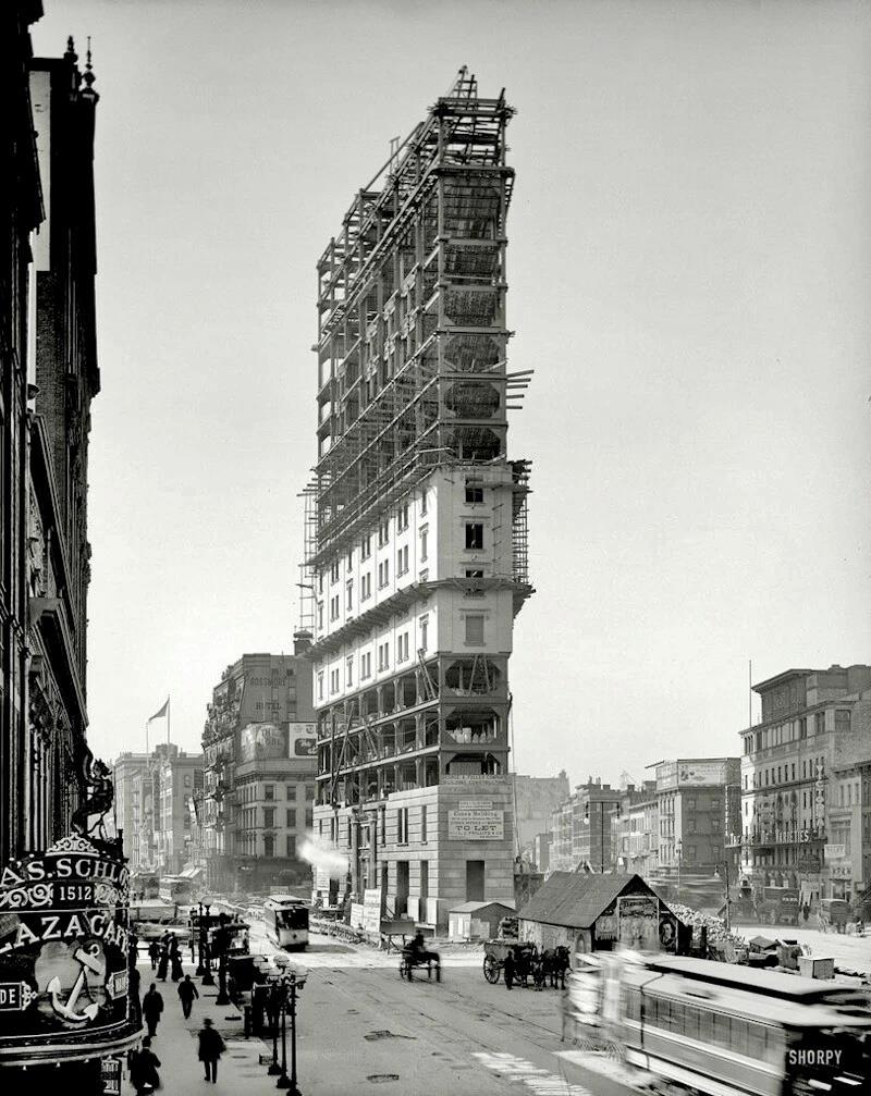 1902 год, Нью-Йорк, Манхэттен. Строительство Флэтайрон-билдинг (Flatiron Building; дословно — «здание-утюг») на углу Бродвея, Пятой авеню и Восточной 23-й улицы.