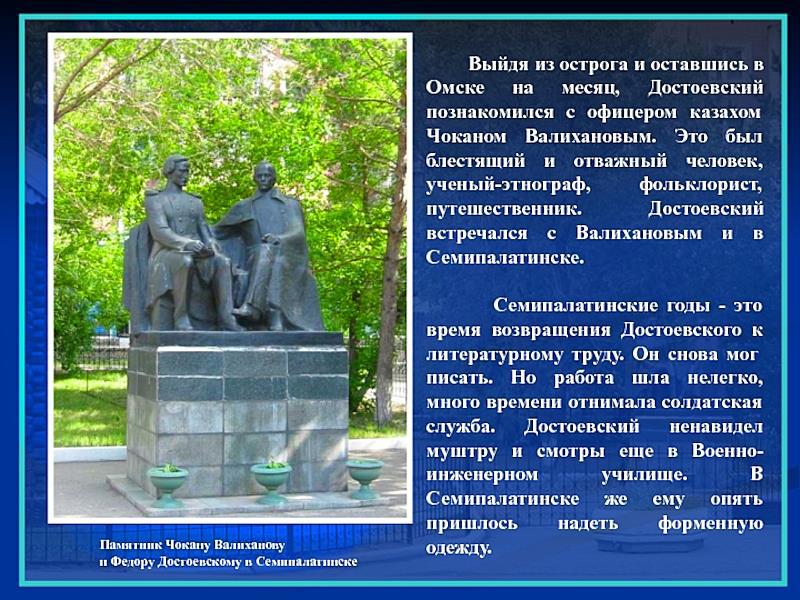 Памятник расположен в скверике возле музея М. Ф. Достоевского и реального дома, где мой любимый писатель проживал во время ссылки.