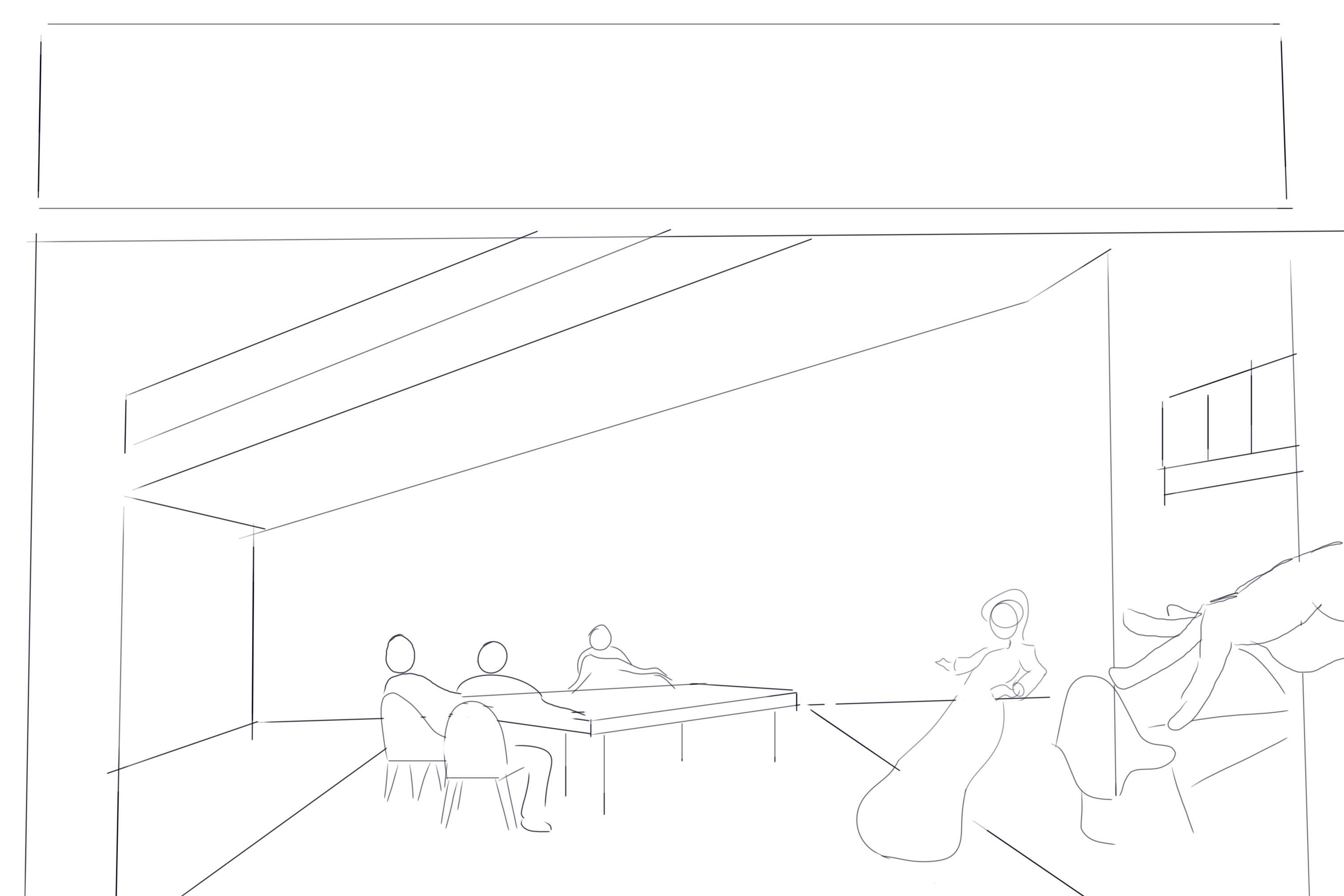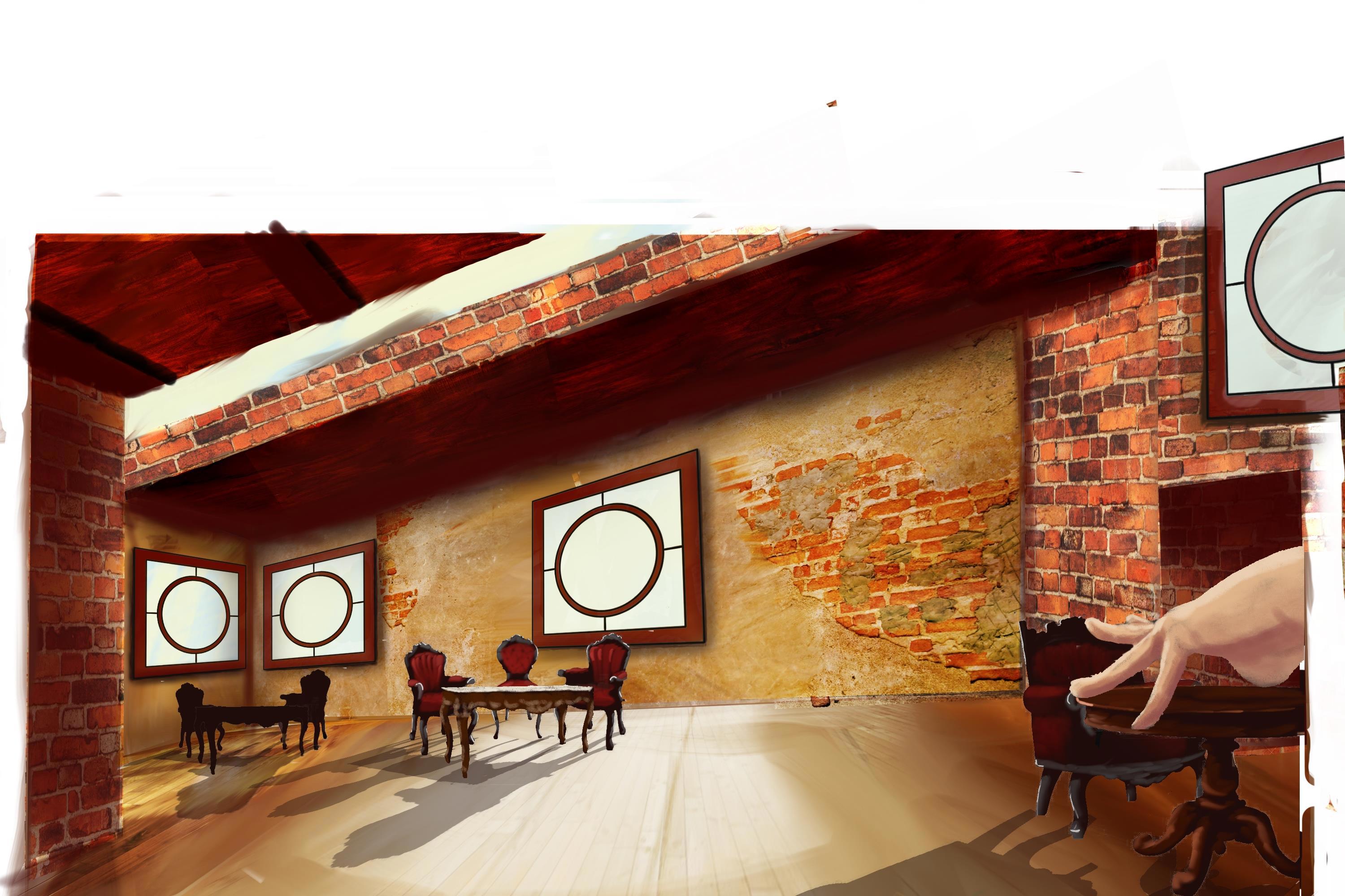 Уже на первом этапе я начала искать рефы. Интерьер таверны слямзен с какой-то фотки, выпавшей по запросу victorian tavern. Я как бы знала, что в конце у меня будет чб картинка, но сразу рисовать в чб мне было сложно. Поэтому я начала в цвете. Пользуясь уроками Харди Фаулера, набросала подложек с фактурой дерева и кирпича в разной освещенности, со световыми пятнами, там, куда должны были падать лучи из окон, размыла это все в ноль и расставила силуэтами мебель.