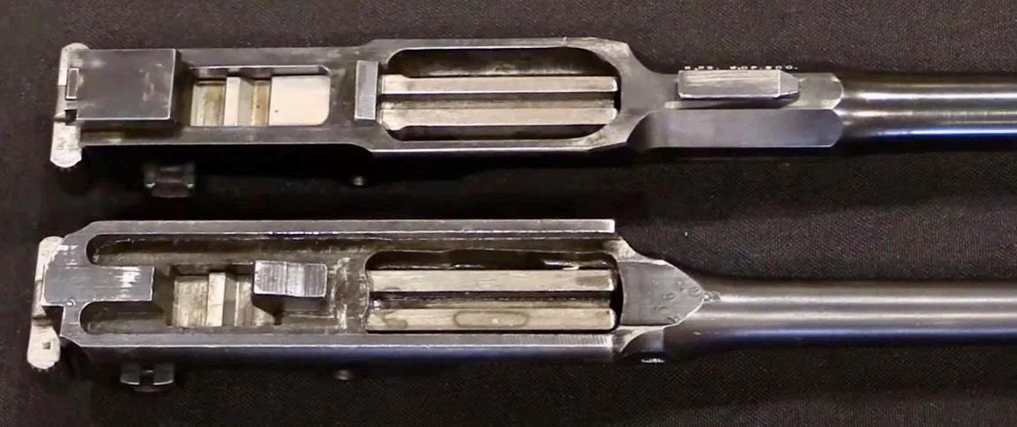 Ствол со ствольной коробкой траншейного карабина Маузера (вверху) и обычного С96 внутри.