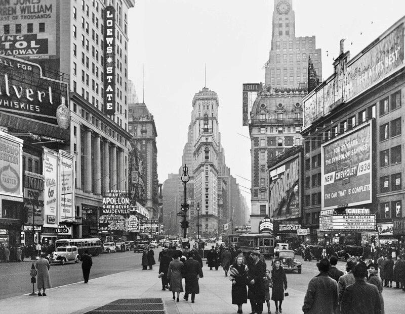 1938 год. Таймс-сквер в Нью-Йорке. Небоскреб «Нью-Йорк таймс билдинг», кинотеатр «Loew's», гостиница «Astor», театр «Gaiety Theatre» и другие достопримечательности.