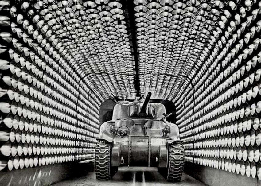 1943 год, США. Танк Шерман в инфракрасном туннеле, который сократил время высыхания краски с обычных 24 часов до 4 минут.