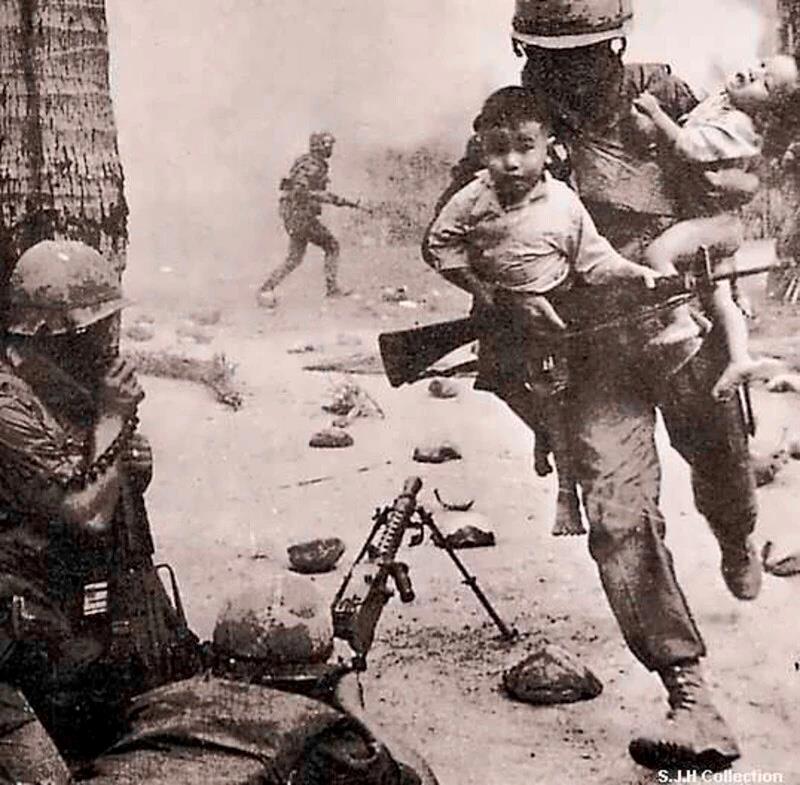 1968 год, Вьетнам, Хюэ. Морской пехотинец США спасает двух вьетнамских детей во время перестрелки в городе Хюэ.