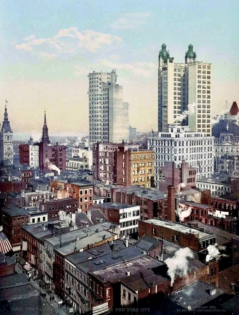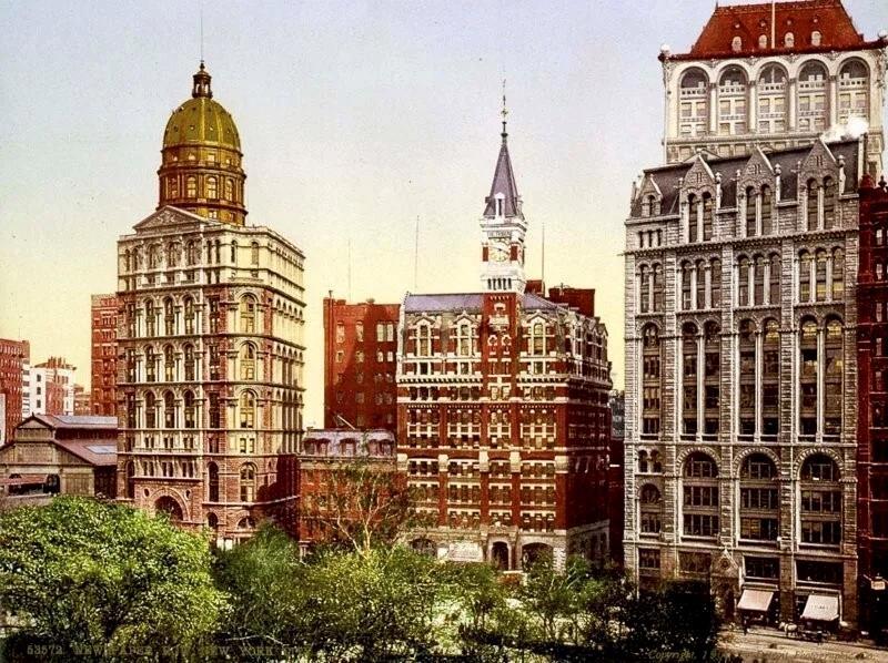 1900-е годы, Нью-Йорк. Газетный ряд. Ньюспейпер-Роу (сейчас Парк-Роу). Здесь находились офисы крупнейших Нью-Йоркских газет. Слева направо: World Building (1890–1955) - офис газеты The New York World, принадлежавшей Джозефу Пулитцеру. Первое здание построенное в Нью-Йорке выше церкви Тринити и самое высокое здание в мире с 1890 по 1894 год. Снесено при реконструкции подъезда к Бруклинскому мосту. Здание с часами - Tribune Building (1875-1966) - офис газеты New York Tribune. Серое справа - New York Times Building (1889).