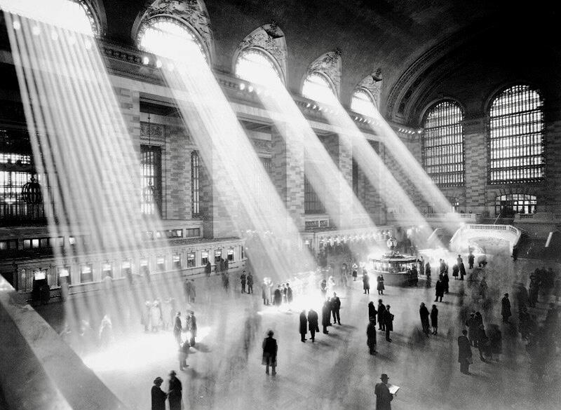 1935-1941 года, Нью-Йорк. Лучи солнца освещают главный зал, кассы и справочную Центрального вокзала.