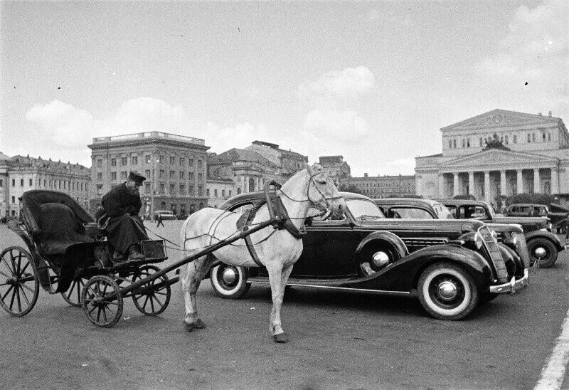 1935–1937 годы, Москва. Извозчик и автомобиль. Стоянка такси у Большого театра. Автор: Аркадий Шайхет.