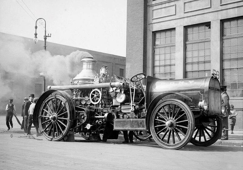 1910-е года. Пожарное депо города Нью-Йорка демонстрирует оснащенный двигателем паровой насос на пересечении 12-й авеню и 56-й улицы.