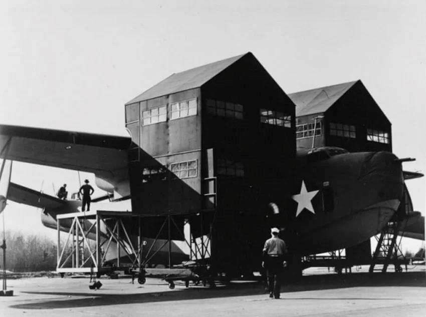 1943 год, США, Мэриленд, Балтимор. Гидросамолёт PBM-3D на авиазаводе Glenn L. Martin. Двигатели самолёта накрыты специальным мобильным укрытием, позволяющим техникам обслуживать двигатели при непогоде.