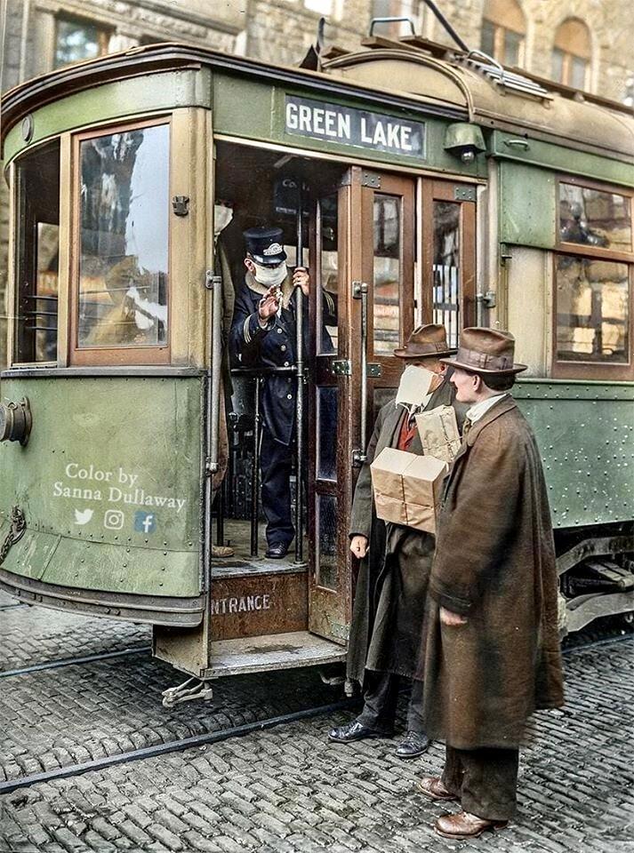 1918 год, США. Кондуктор в трамвае не пускает пассажира без маски во время эпидемии испанки.
