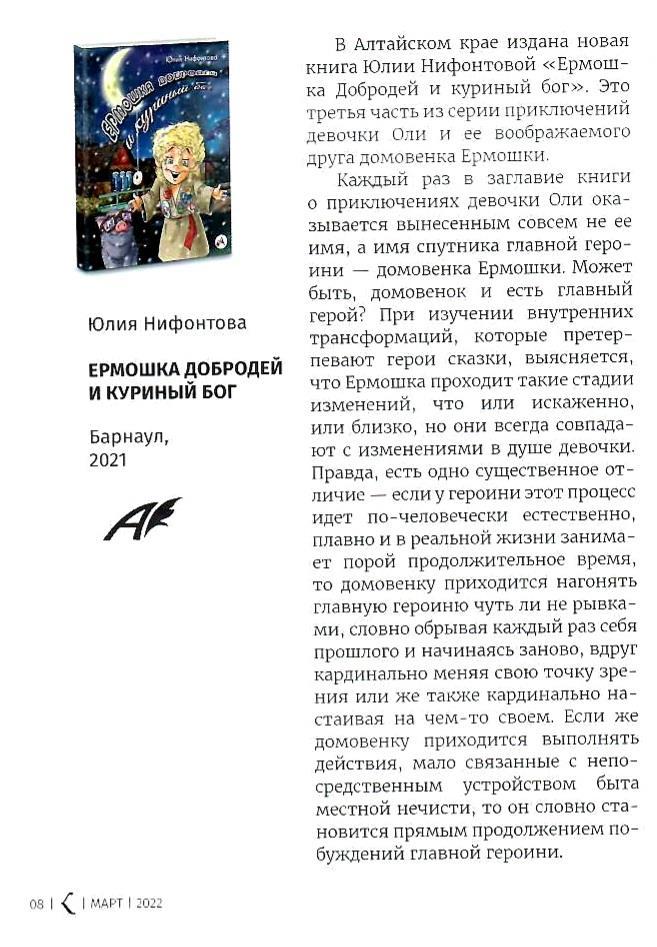 Автор: Юлия НифонтоваВ журнале "Культура Алтайского края" № 1/2022 (гл. ред. Л.А. Вигандт) вышла объёмная рецензия Ивана Образцова на мою книгу для детей "Ермошка Добродей и куриный бог"