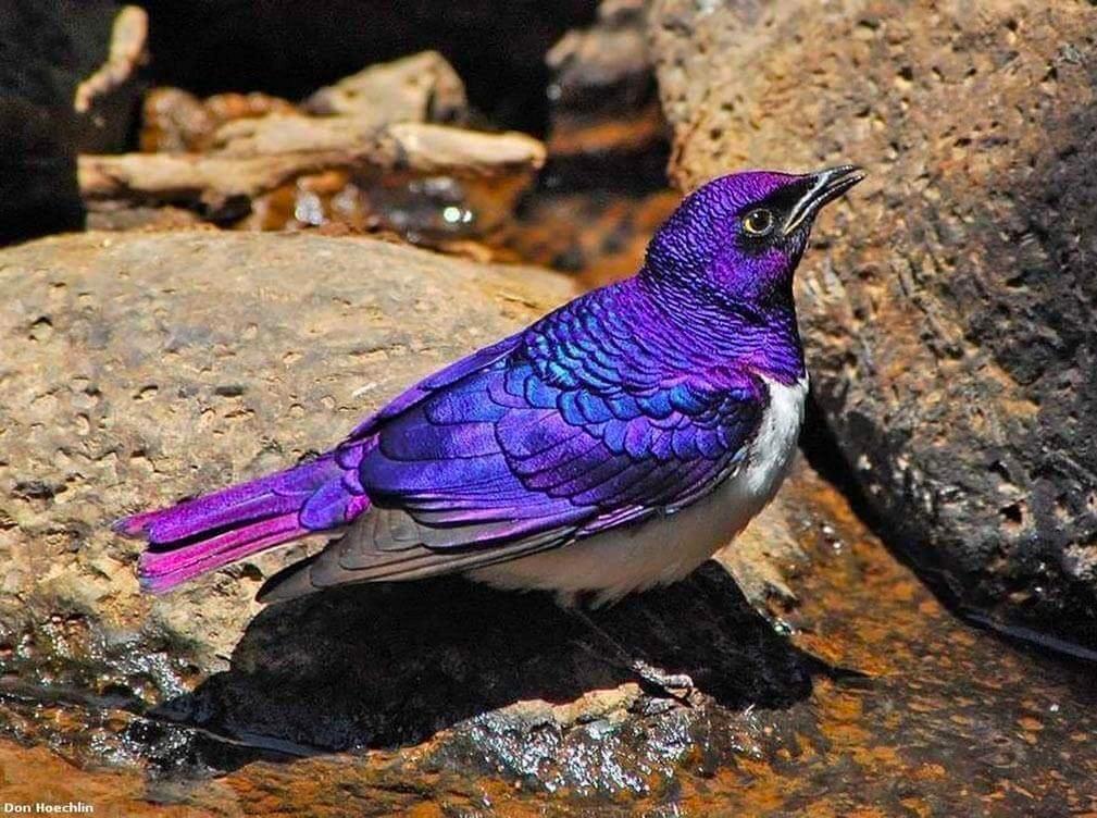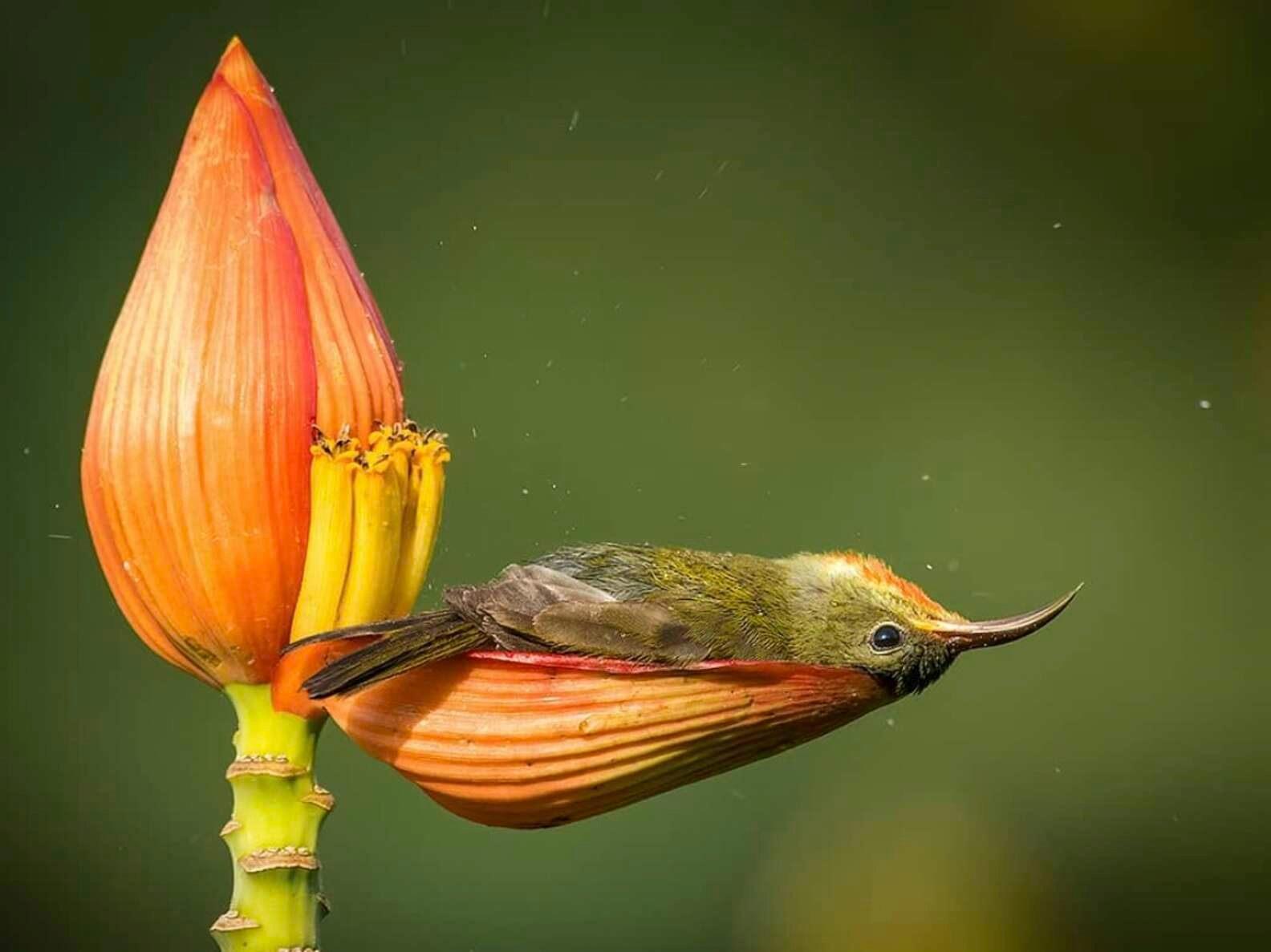 Самка желтоспинной острохвостой нектарницы освежается водой, которая хранится в лепестке декоративного бананового цветка, как будто природа создает для нее цветочную ванну.