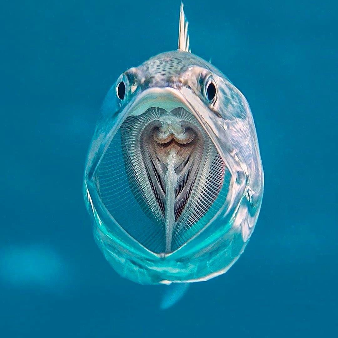 Полосaтая cкумбрия широко раскрывает рот во время плавания, чтобы отделить зоопланктон от воды. Жабры выполняют функцию рыболовной сети.
