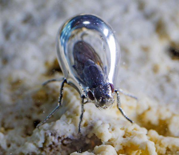 Марк Твен в своих путевых заметках, которые переросли в повесть "Налегке", подробно описал свое удивление от встречи с обитателями соленого озера Моно, а именно представителями семейства мух-береговушек. Эти мухи способны погружаться под воду на глубину до двух метров, питаться там водорослями, а также откладывать яйца и при этом в прямом смысле слова выходят сухими из воды. А все благодаря способности окружать себя пузырьком воздуха, который играет роль скафандра. Главный же секрет образования воздушного пузыря в воде - явление экстремального водоотталкивания или супергидрофобности. А достичь этого эффекта мухам Ephydra hydropyrus удается благодаря повышенной волосатости. Таким образом при нырянии вокруг мухи образуется воздушный "скафандр", и насекомое спокойно ест водоросли в сверхсоленом и ядовитом озере. Уровень солености воды в Моно в три раза выше чем в океане, также она отличается высокой щелочностью. Неудивительно, что из-за экстремальных условий среды в озере выживают лишь водоросли и небольшие рачки, ну и, конечно, мухи в скафандре.