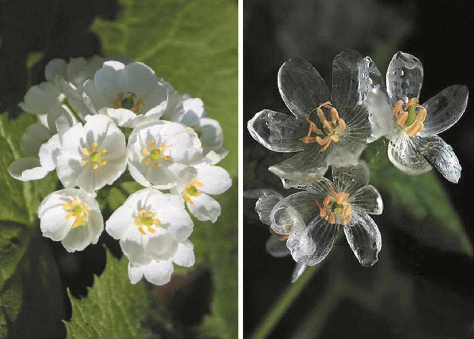 Этот удивительный цветок обладает чудесным свойством становиться прозрачным, соприкасаясь с водой, например, во время дождя. При контакте с водой лепестки теряют пигментацию и начинают волшебным образом сиять, словно кристаллы. Из-за этого эффекта цветок еще называют «skeleton flower». Двулистник Грея, как правило, растет на влажных лесистых горах в холодных регионах Японии и на Сахалине. Этот очаровательное растение, увы, находится на грани вымирания, поэтому занесено в Красную книгу.