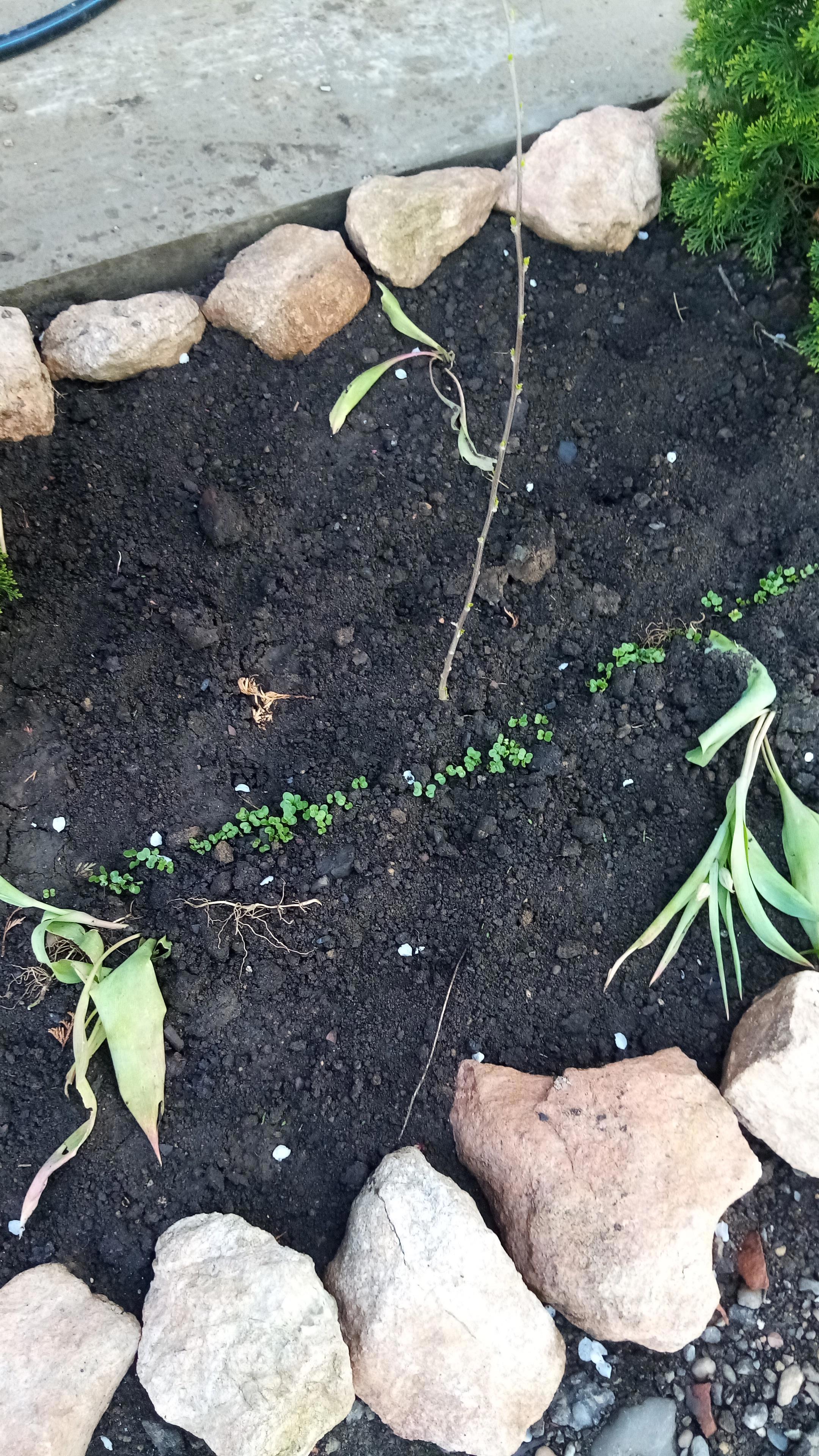 А это редиска вошла. Тюльпаны вокруг не мёртвые, они просто болеют после пересадки, цветы на них на следующий год будут.