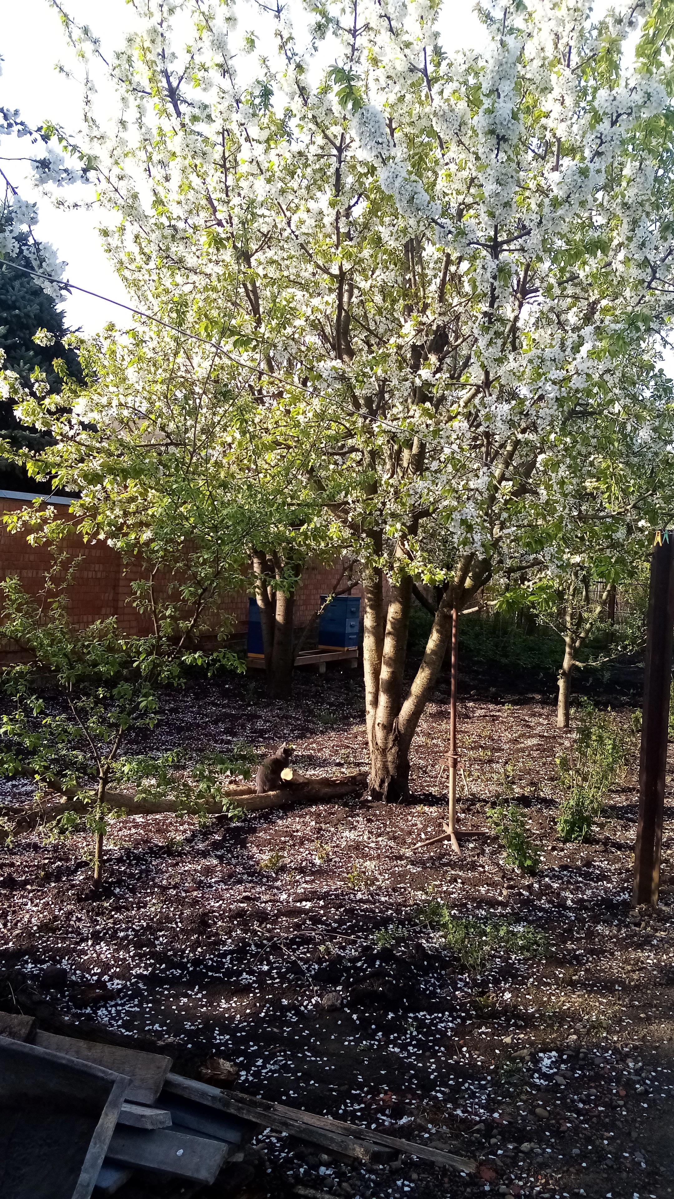 Черешня почти отцвела, под ней два улья, ждут своих пчёл. Кошка просто гуляет, маленькая хищница.
