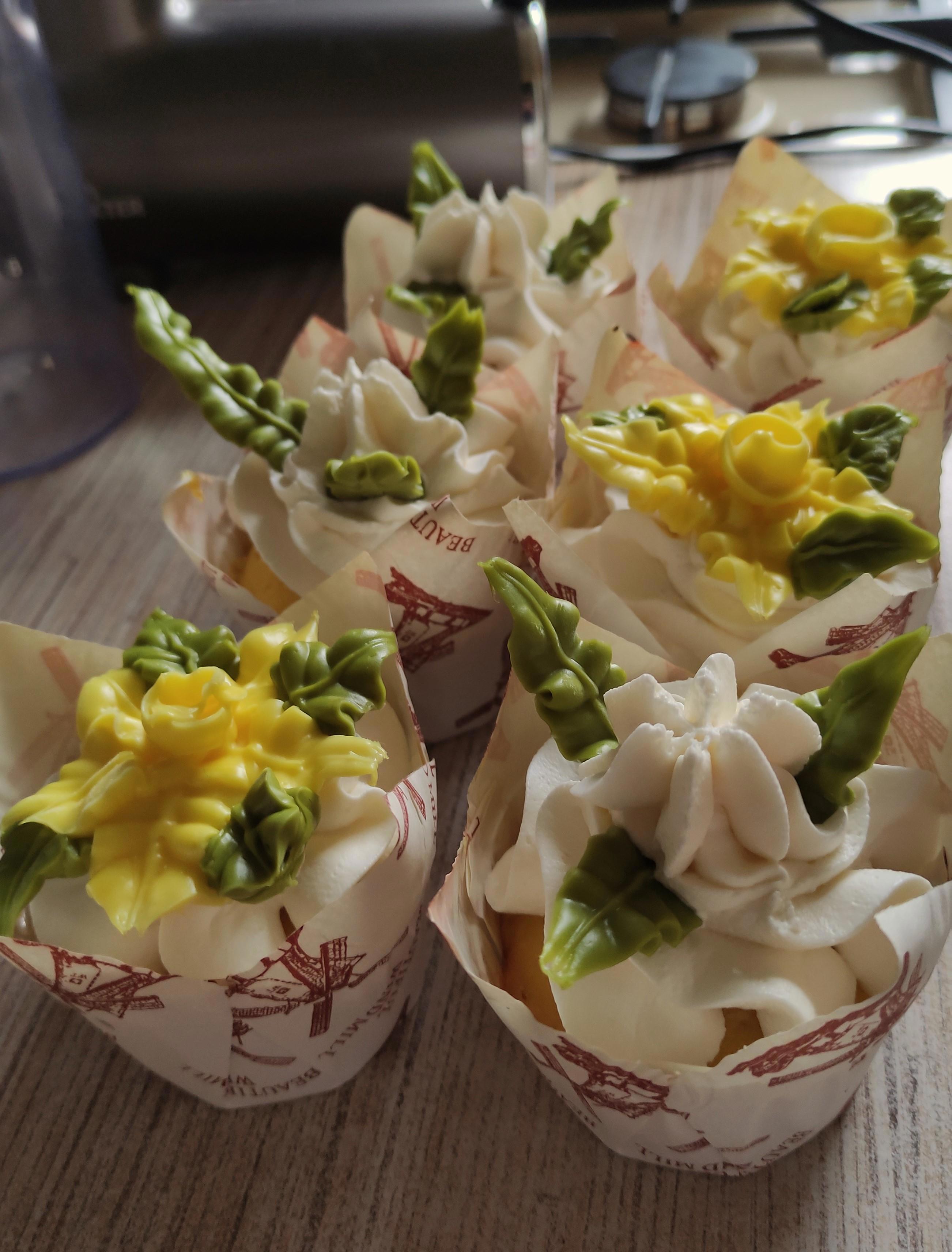 Автор: Екатерина БелецкаяПривет, народ! Четверговая прода лежит и ожидает тех, кто ожидал развития событий. А я пошла на ДР к подруге, обещаю не пить пить не много, и вести себя прилично - по возможности. Ну и... вот, собственно, хотела вам показать подарочные капкейки, которые сварганила для Настеньки. Заказ был на лимонные, поэтому они лимонные, с лимонным бисквитом, лимонным курдом, и взбитыми сливками. Нарциссы (она обожает нарциссы) сделаны из крема шантифлекс, который не растекается, не боится тепла, и был придуман в Бразилии, потому что бразильцам тоже хотелось кремовых цветочков, а у них жарко, и обычные цветочки быстро приходили в негодность, ну и вот. Не сказать, что он особо вкусный, но съедобно. Похож на манную кашу немножко =) А еще его можно замораживать, поэтому сейчас в морозилке прозябают листочки, которые пойдут потом на украшение куличей.