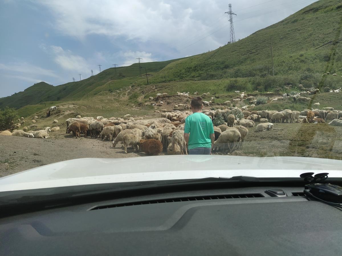 На одном из проездов сыну пришлось разгонять с дороги стало баранов и коз.