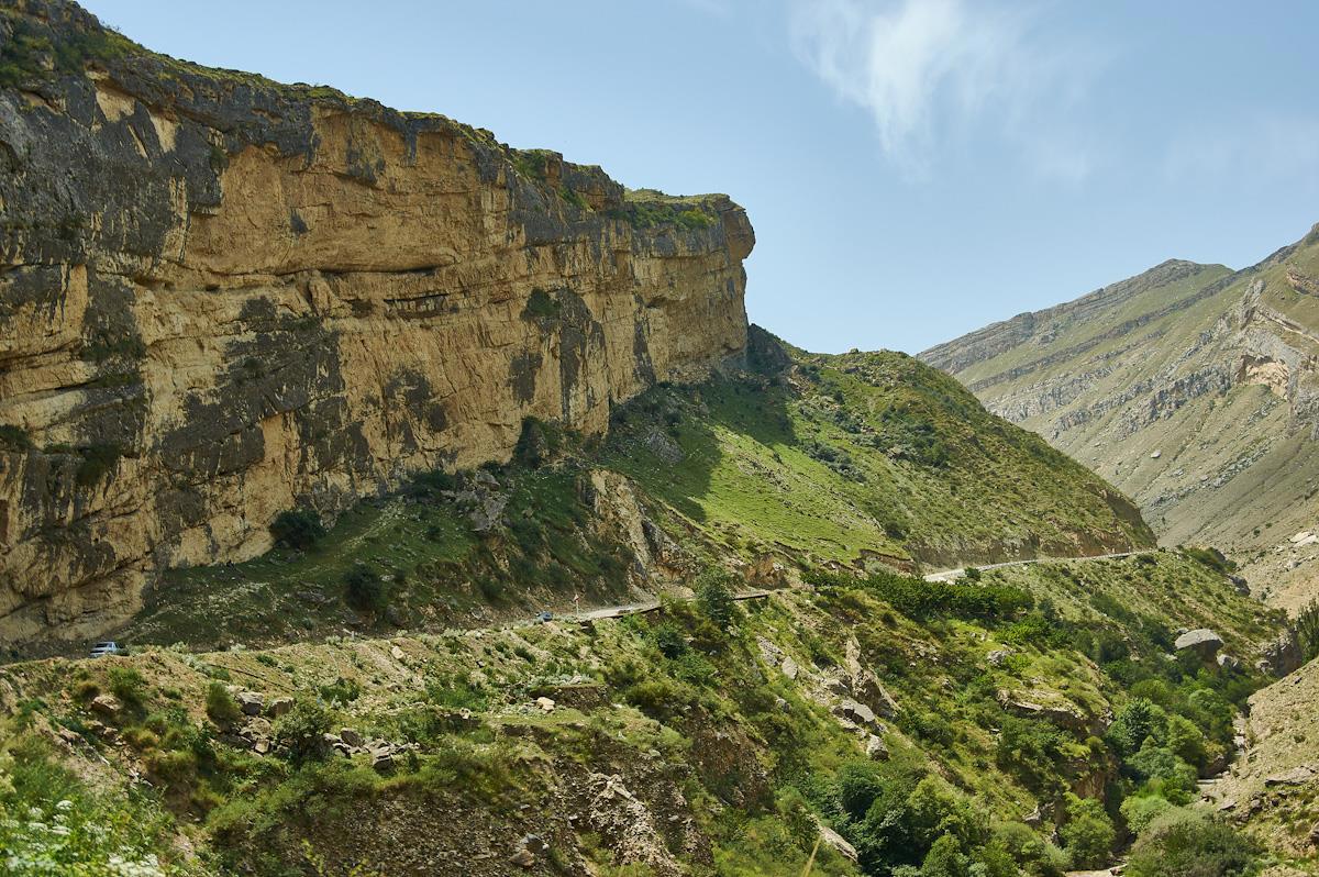 Дальнейшая трасса на протяжении километров двадцати достойна отдельного описания. Зачастую идущая вдоль отвесной стены около пропасти, она даже на меня она произвела неизгладимое впечатление, что говорить о сыне. Он, наверное, уже не надеялся доехать до места. Временами было страшновато. Нависающие над тобой скалы наводят на мрачные размышления. Например, когда именно с них падают эти огромные камни? Так и ехали по узкому извилистому полотну нависающему над пропастью, в которой текла река Дживус.