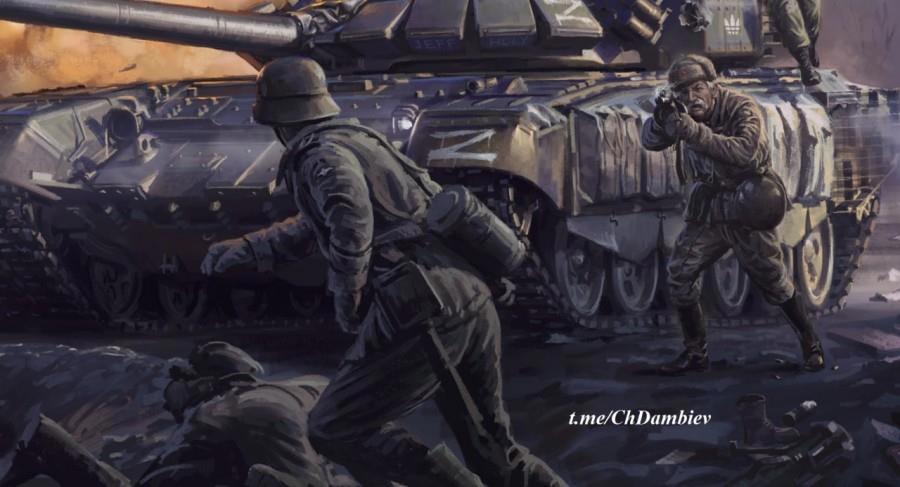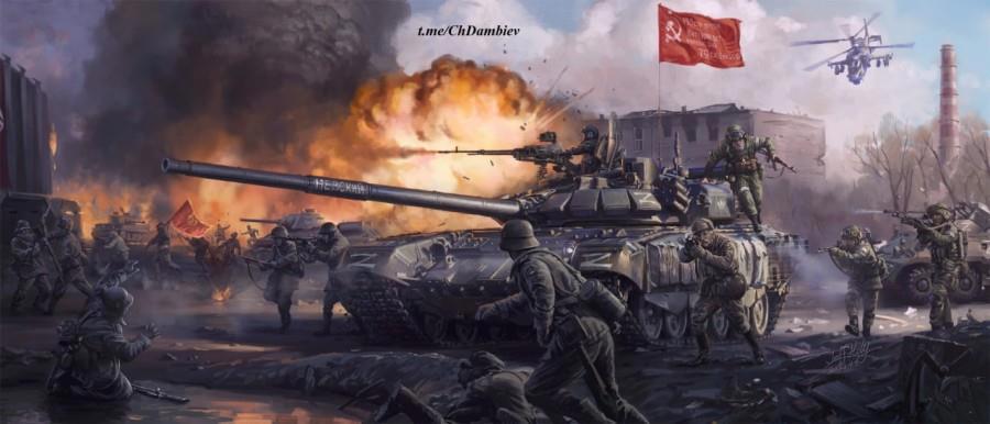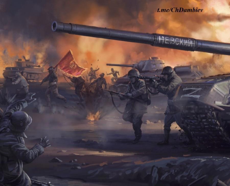 Ну а следующая картина поистине эпохальна и художественна. Соединены две разных эпохи. И если уж на этом портале их забанят, то что-то неладно в нашем королевстве. Тема ВОВ у нас разве уже запрещена? Jeff Holy мастерски вплел в батальную сцену именно русское видение ситуации. Почему русские этого стыдятся, я искренне не понимаю.