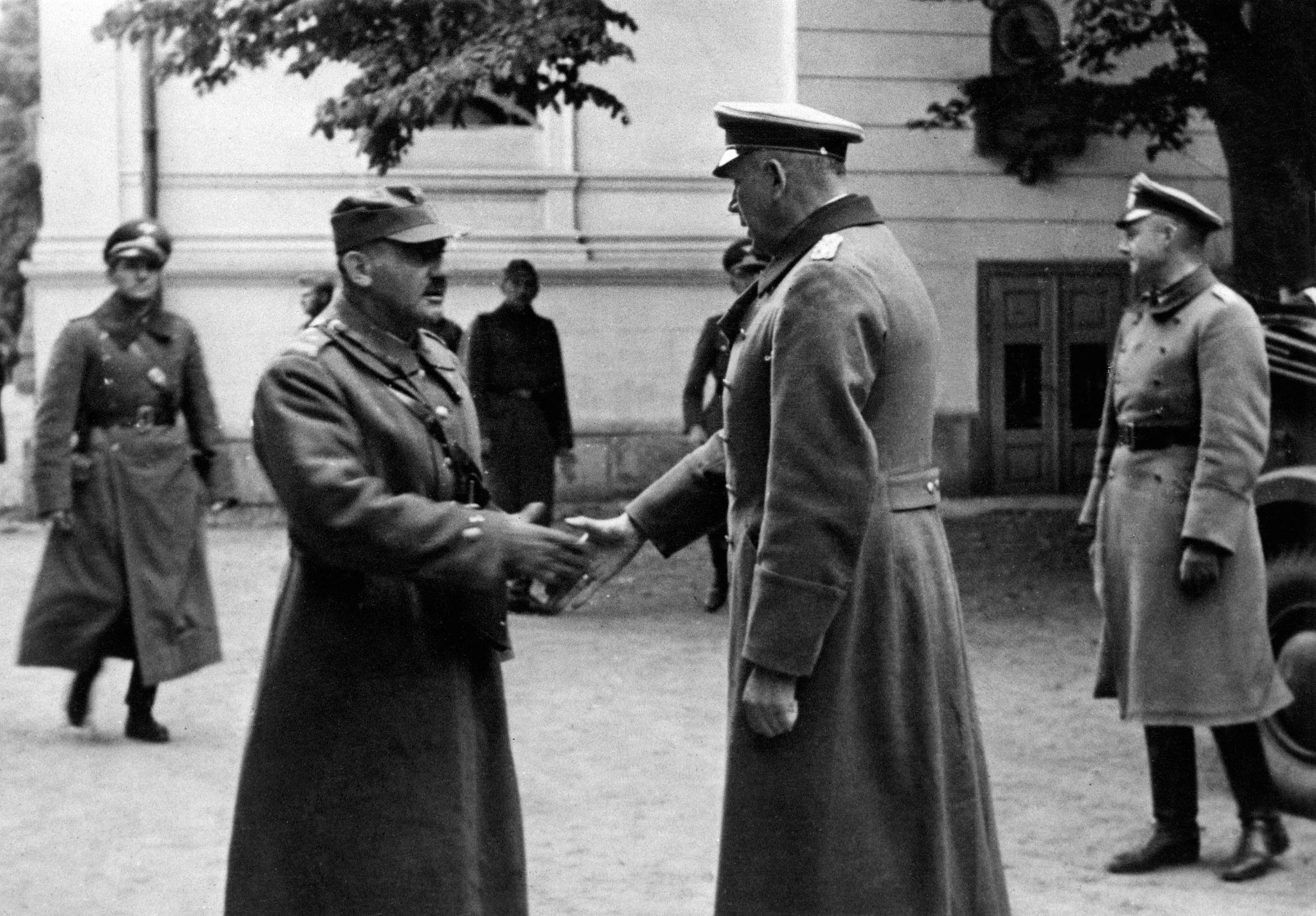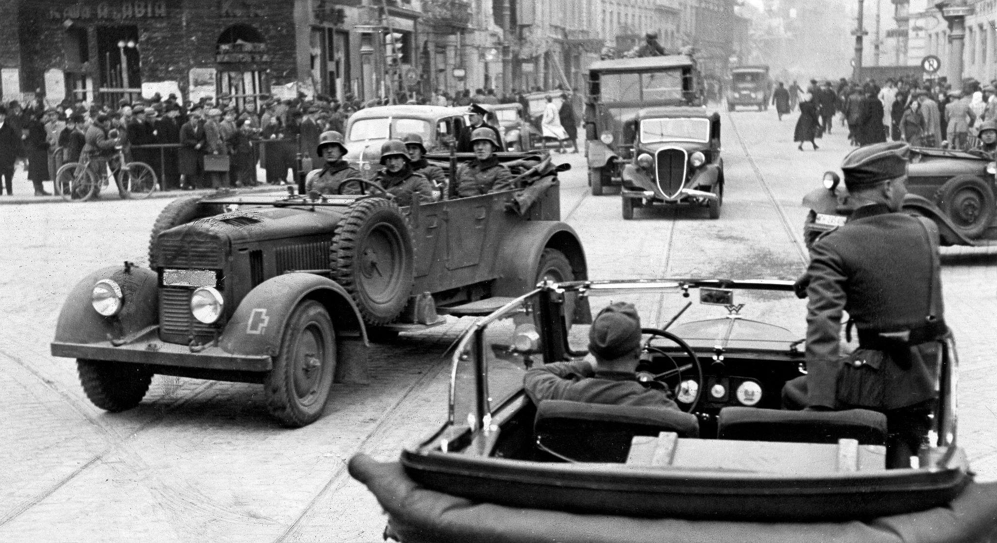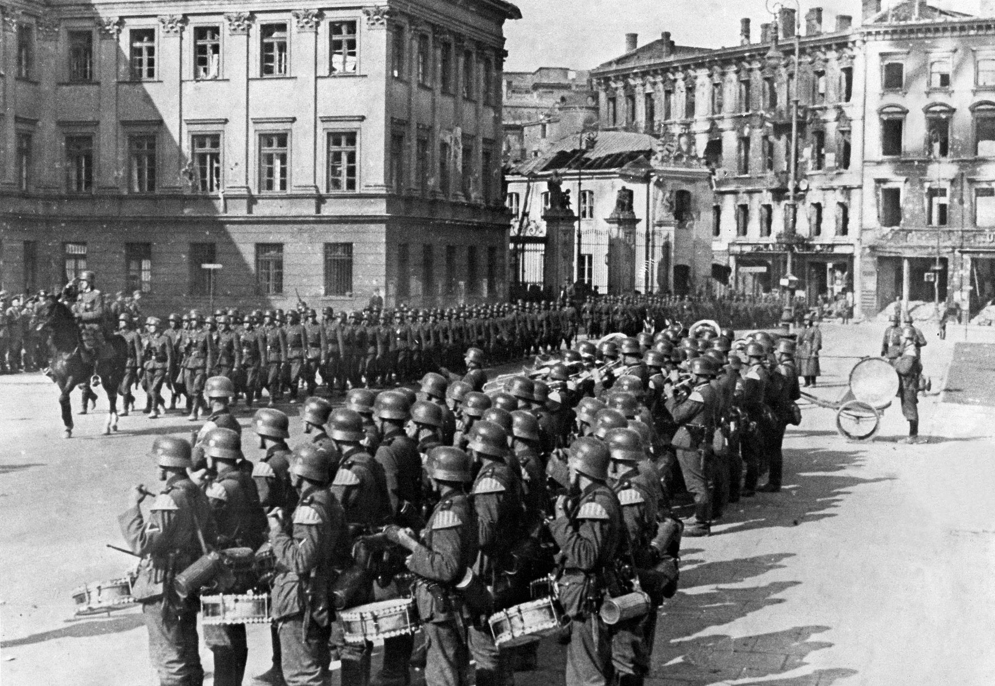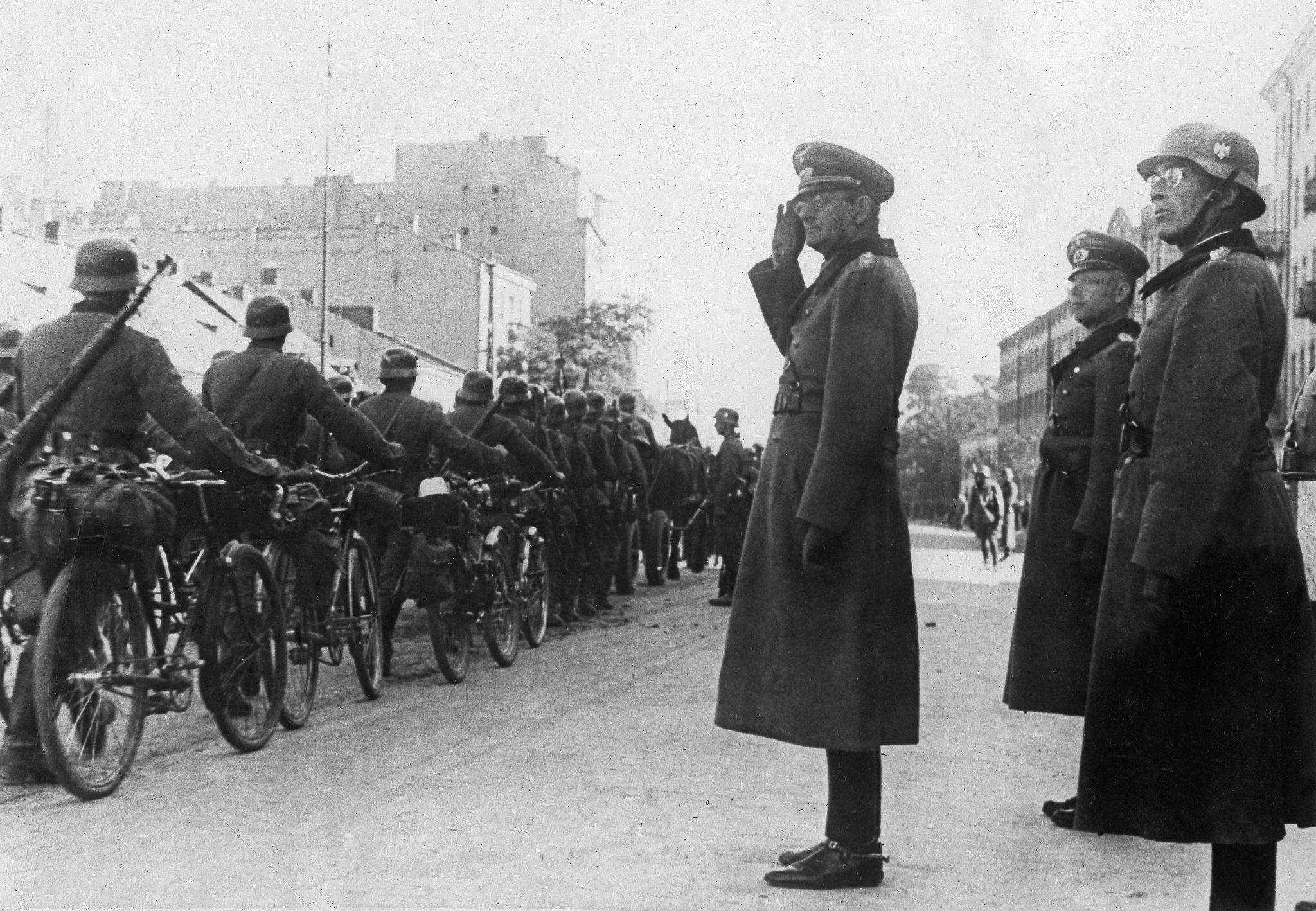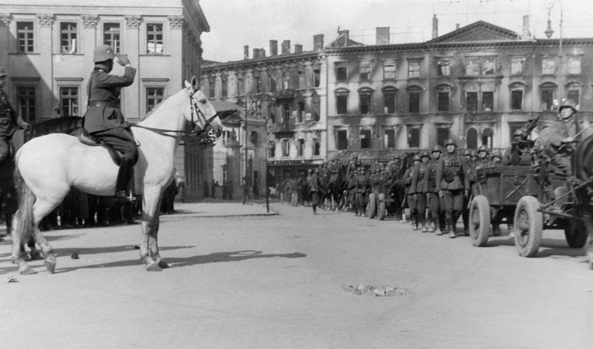 Немецкие войска входят в Варшаву. Проход войск мимо генерала Максимилиана фон Вейхса (командующего XIII армейским корпусом) на площади Пилсудского.