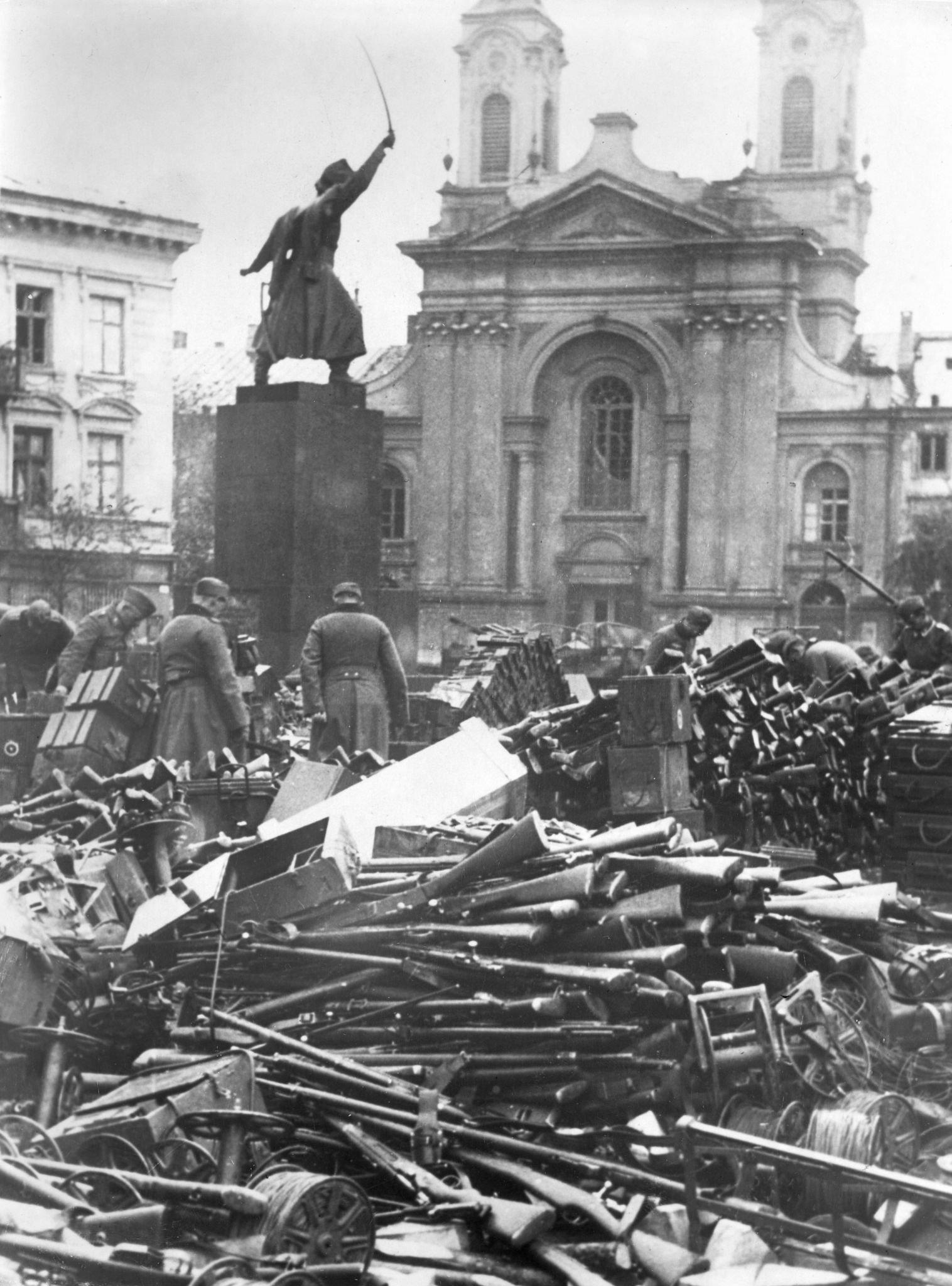 Винтовки и боеприпасы, захваченные у поляков в оккупированной немцами Варшаве, сложены на площади Красинки у подножия памятника Яну Килинскому.