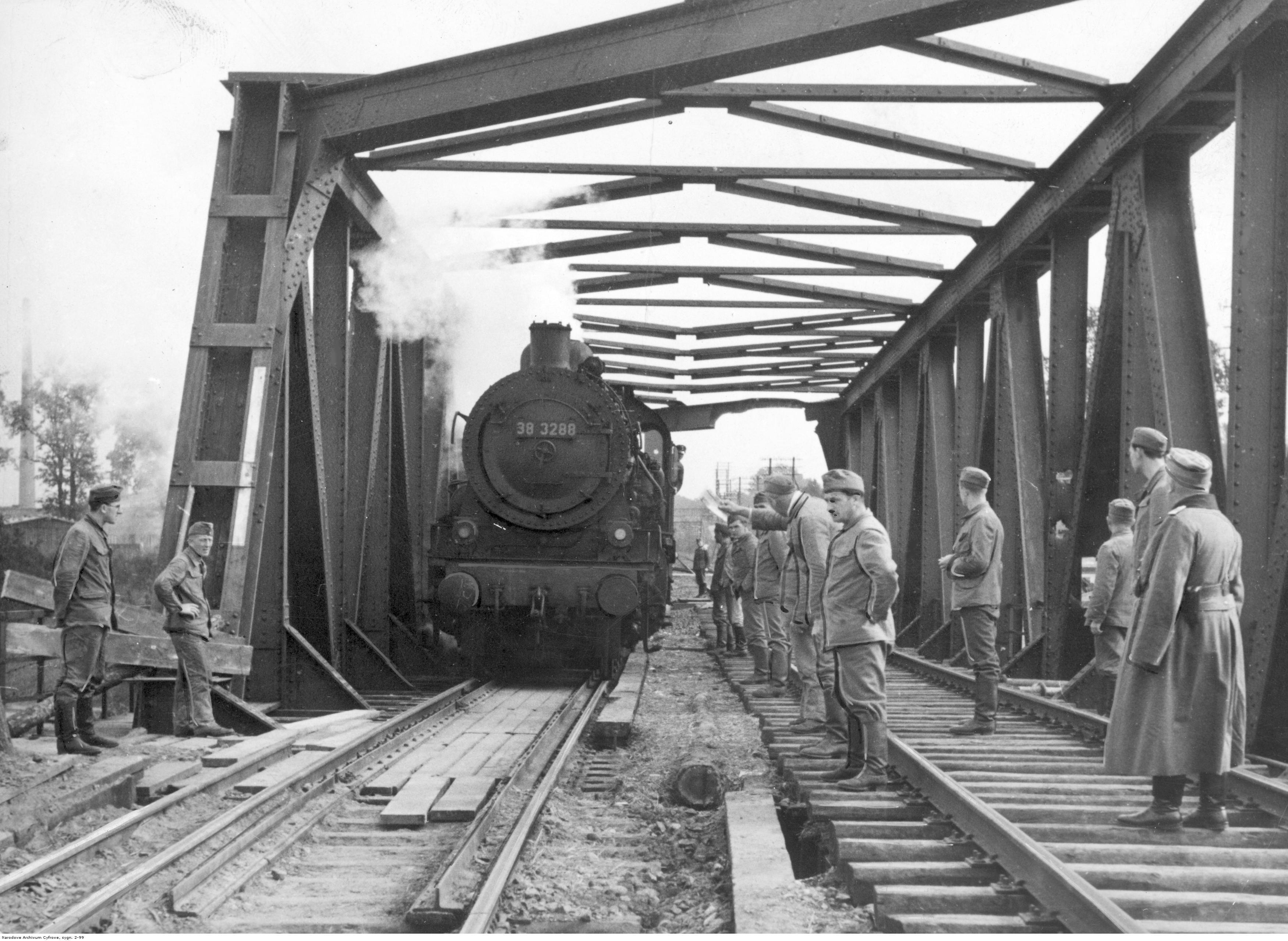 Поезд, в котором проходили переговоры о сдаче Модлинской крепости, заходит на мост.