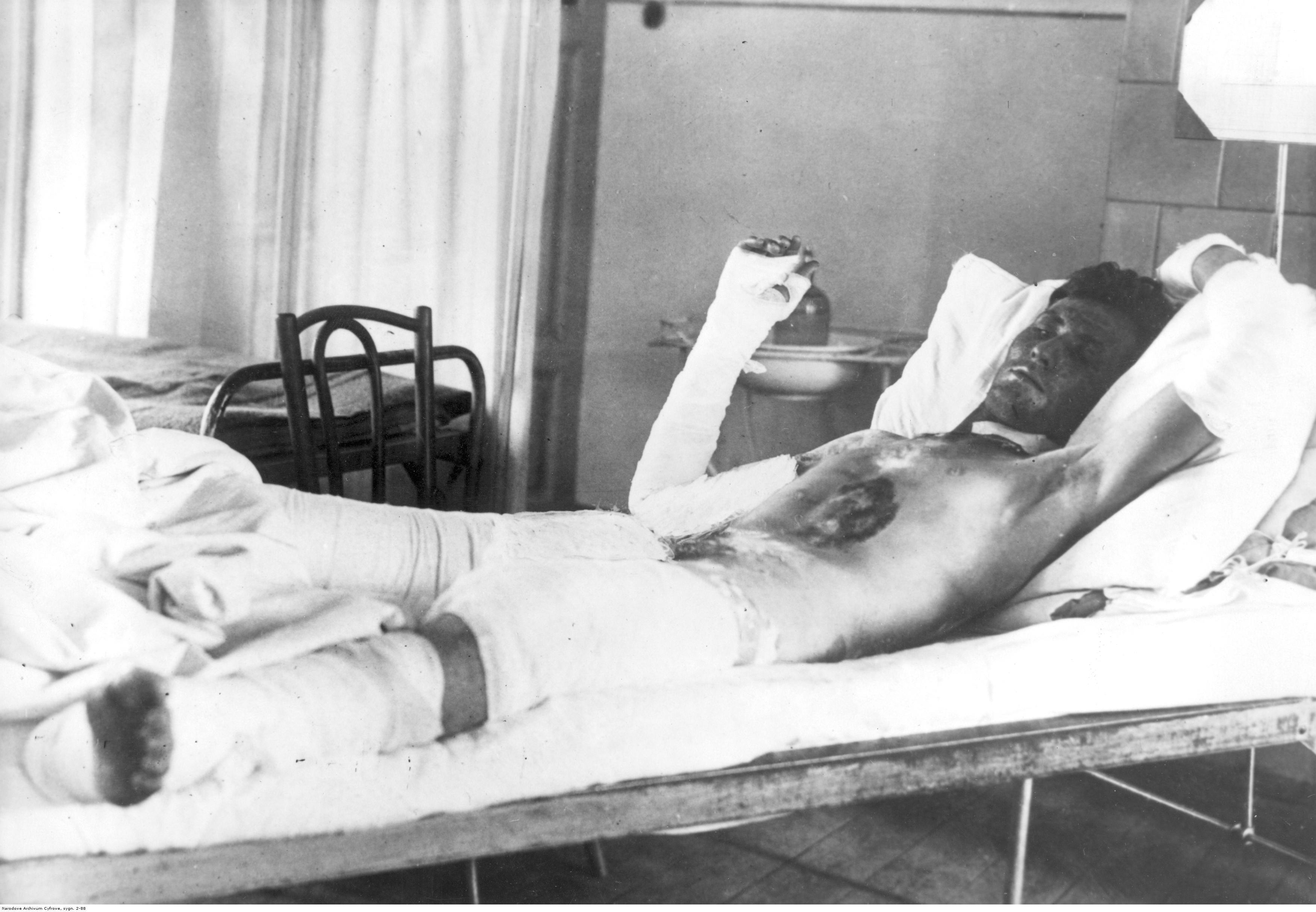 Немецкий сапер по имени Хаун лежит на больничной койке, жертва применения горчичного газа в Ясло польской армией.