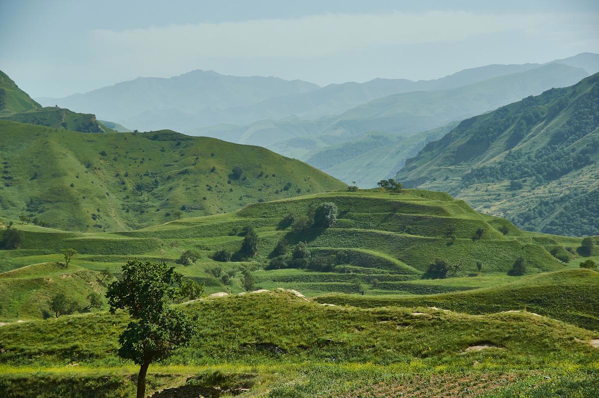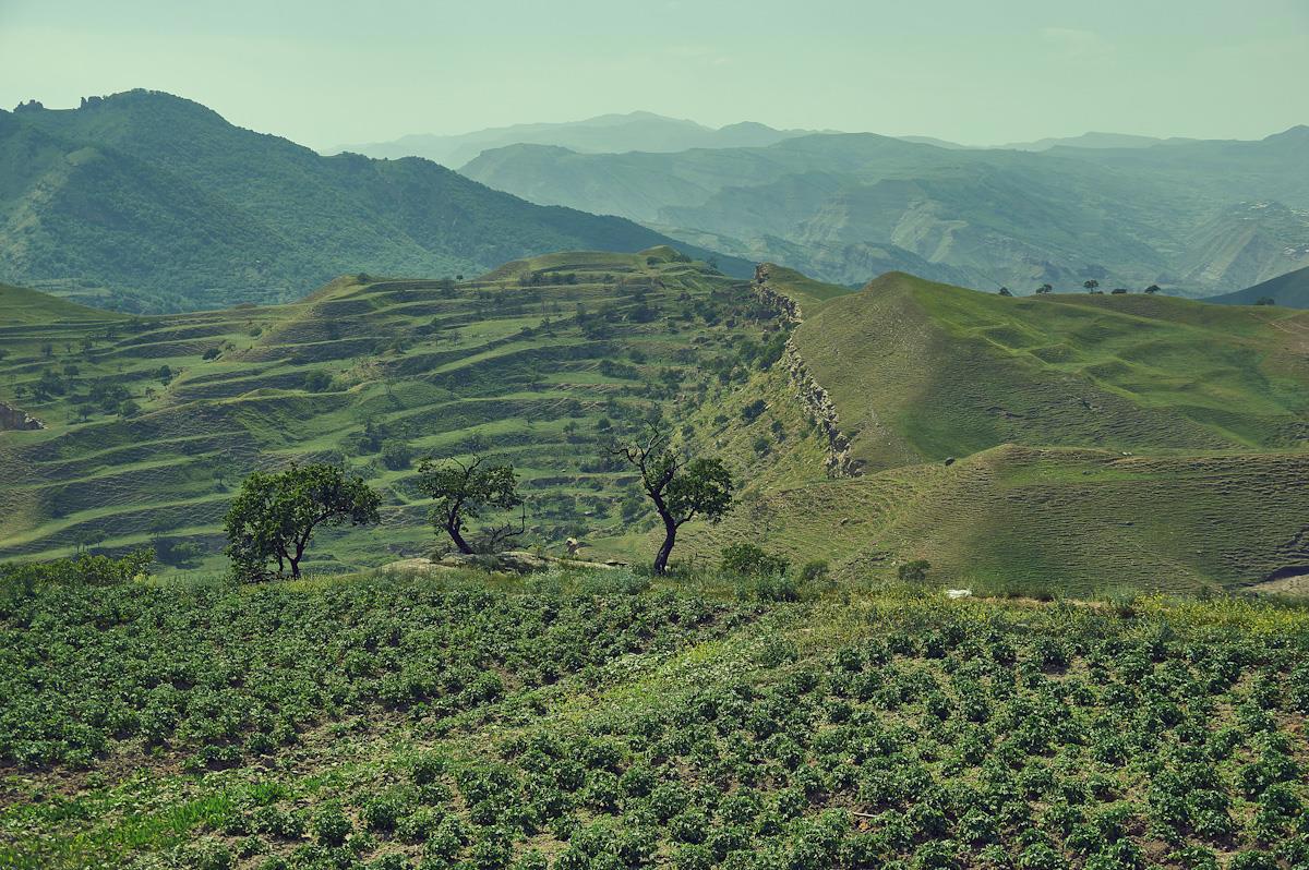 Уходим из долины реки Каракойсу в горы. Немного серпантинов и вот они поля на террасах.