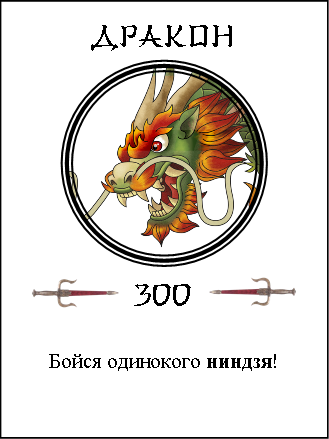 Начну с самого сильного — дракон. Обладатель трёхсот изначальных очков, который может без труда сожрать любого самурая, асигару и тайсё послабее. У воина-дракона нет особых способностей. Он просто очень толстый. И при этом уязвимый. Если игрок, у которого на руках есть карточка дракона, сходится в поединке с одиноким ниндзя, он отдаёт ему эту карточку. Ниндзя превращается в тайсё (с силой в 350), и бывший обладатель дракона (если у него было на руках что-то ещё) должен бежать от него подальше.
