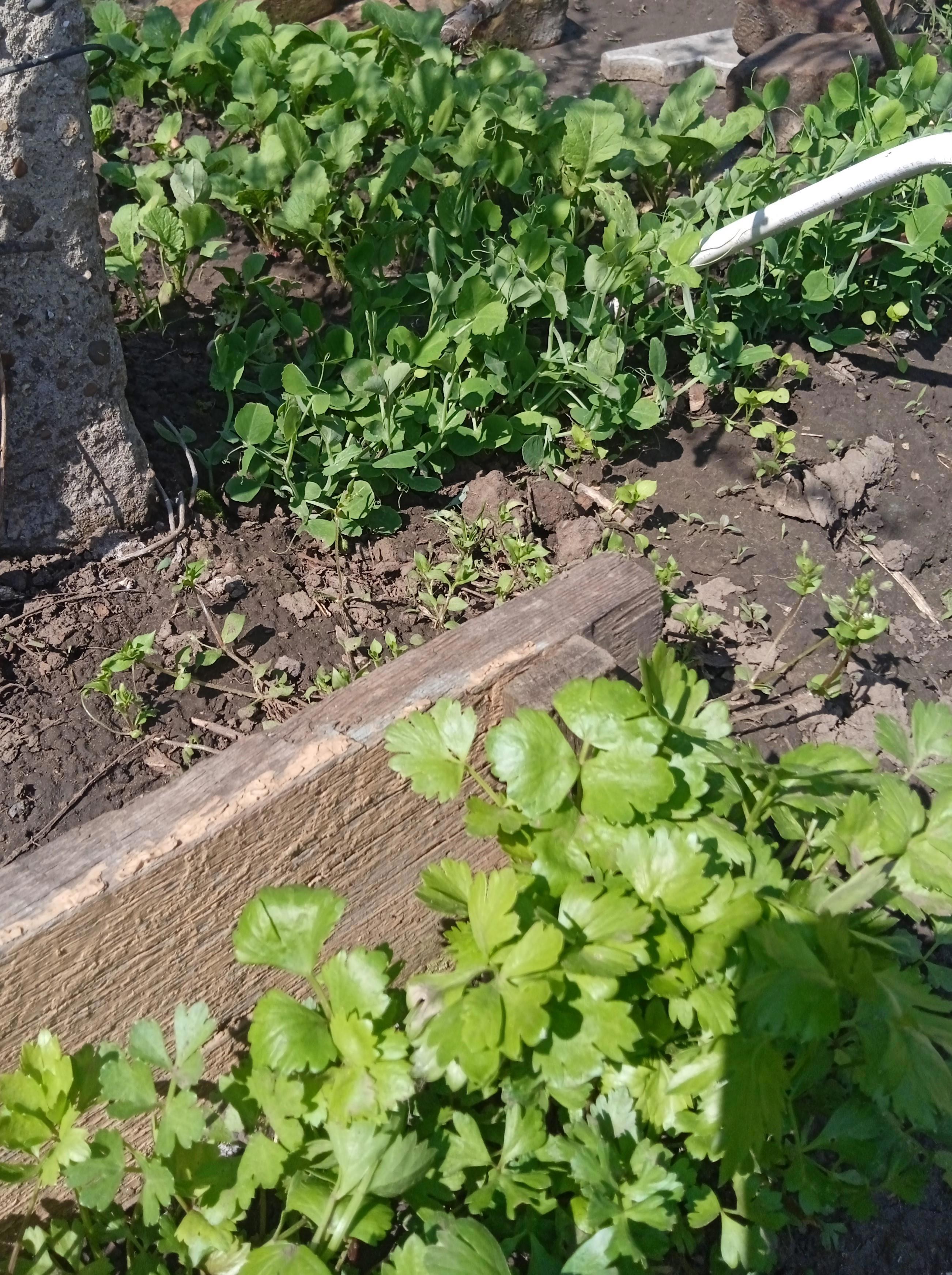 Ну, и обычные садовые вкусности у меня растут тоже. Айва, нектарина, смородина, которую недели через две можно будет есть, клубника. Помидоры, картошка, горох, сельдерей и редиска