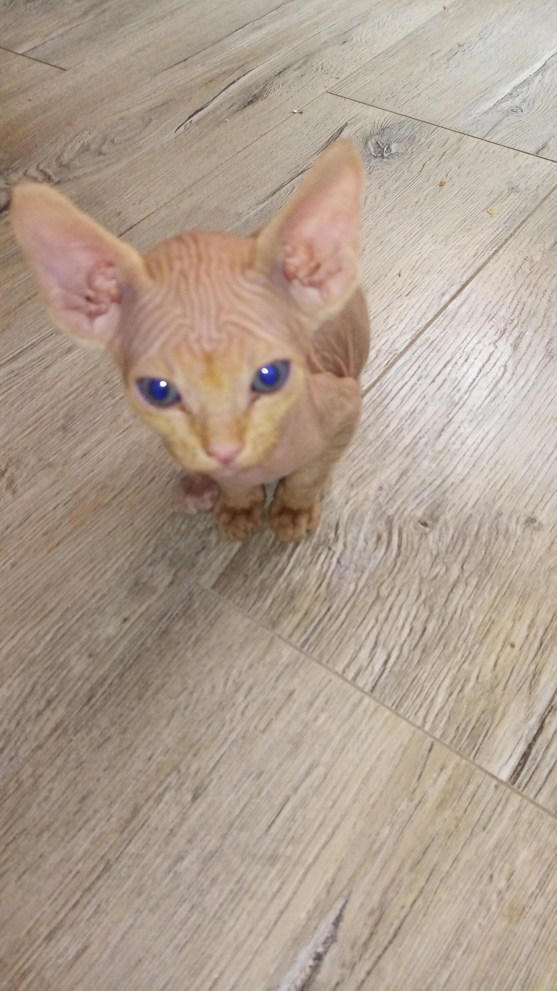 Оно тёплое, лысое, умеет мурчать и мяукать, приучено к лотку. Мужа от его вида передергивает, я пребываю в шоке. Кажется, что шкура у него прозрачная и через неё просвечивают хребет и ребра. Хотя животик, как у всякого нормального котёнка, кругленький и кушает он хорошо.