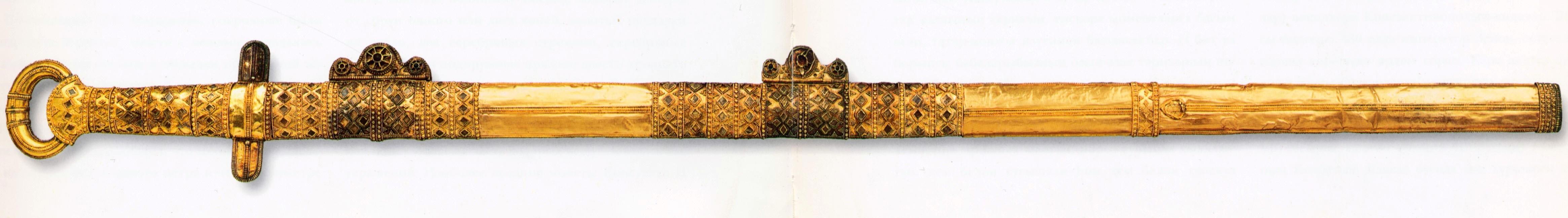 Стальной меч длиной в 942 мм с золотой рукоятью и золотыми ножнами, который по преданиям хан Кубрат получил в подарок от Византийского Императора. В этой связи хочется уточнить – Кубрат считался «другом» Византийского императора. Очень интересный факт, если учесть, что в политике друзей и родственников не бывает вообще-то. Получается, что Великая Болгария была не такая уж и великая, а была просто сателлитом Византии. Хочу обратить ваше внимание на рукоять. Такая форма характерна для куда более ранних скифских мечей... к чему бы это?