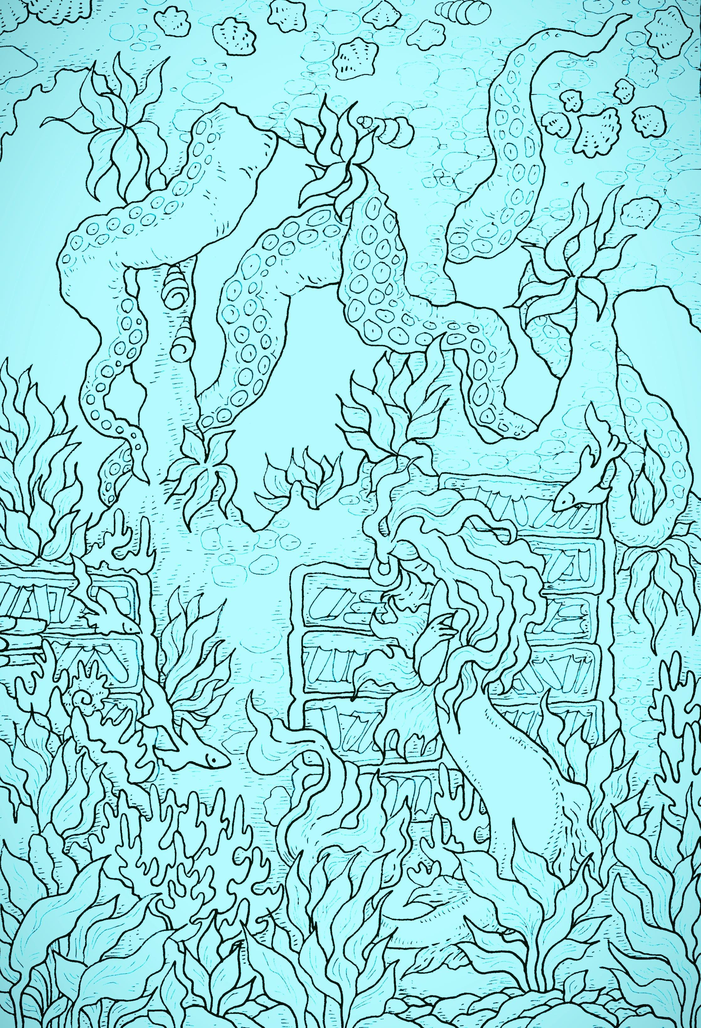 Поэтому я нашла прошлогодний рисунок, из которого горела идеей сделать раскраску. Маленькая русалочка в затонувшей библиотеке