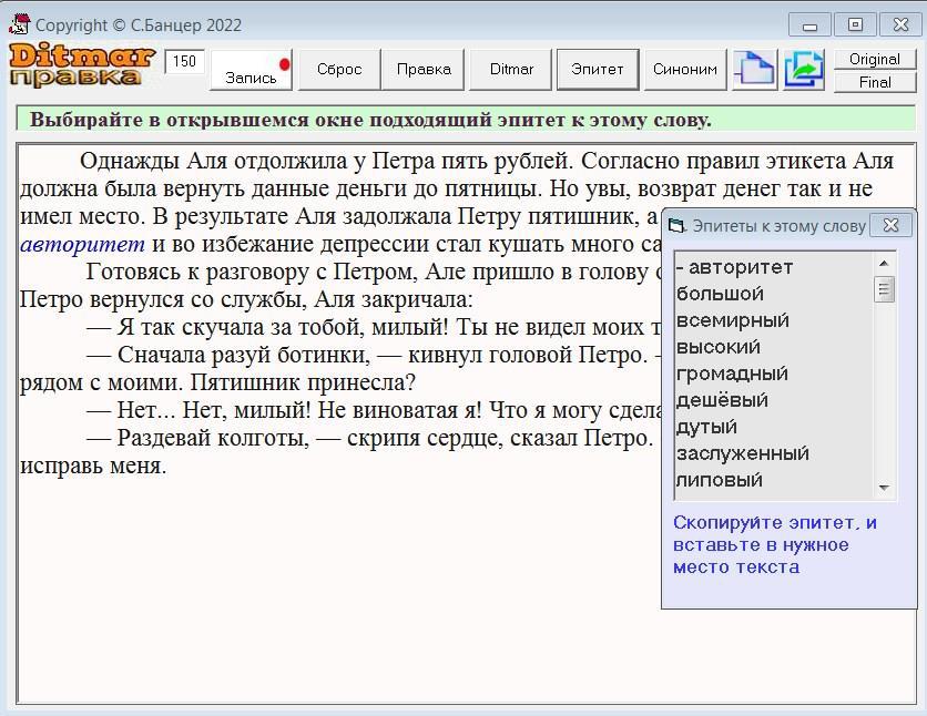 Получилось вот так (это приложение пакета "Помощник Дитмар" - "Дитмар правка", а текст в окне - это тест-новелла "Бедная Аля"):