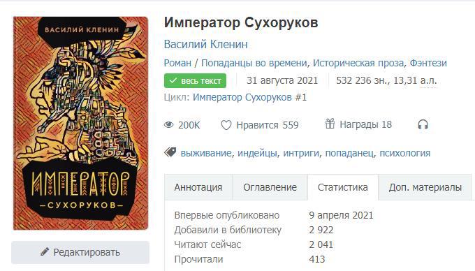 Это, уж простите, мой «Император Сухоруков». 200 тысяч раз (уже больше) вы сунули свои любопытные носы в эту забавную и грустную историю про непутевого попаданца, чем очень подняли мне настроение и немного – ЧСВ. Судя по вашим лайкам и библиотекам – кому-то даже зашло! Это радует.