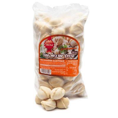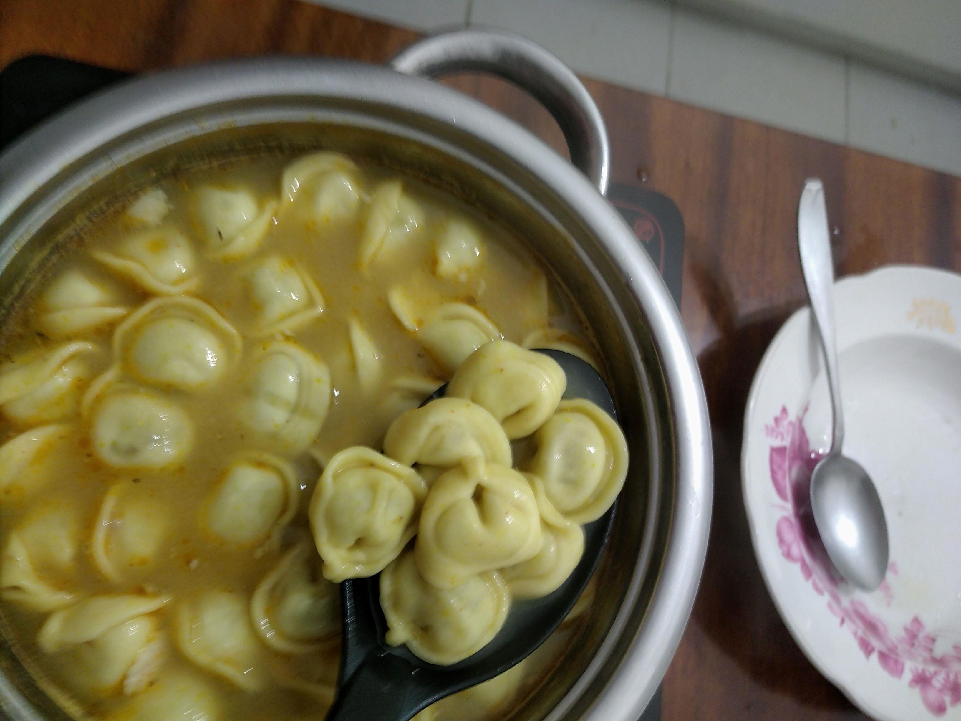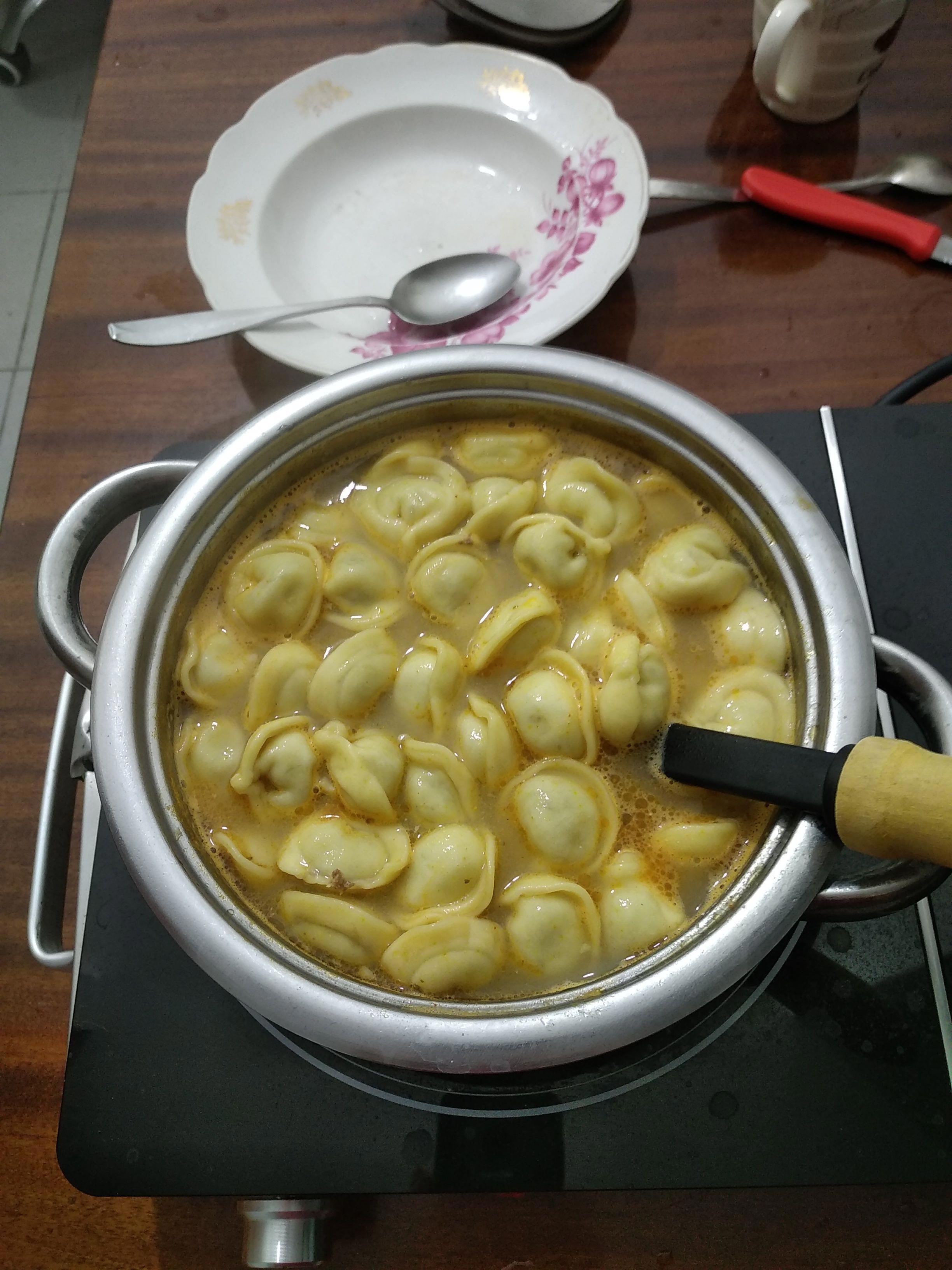 Доливаю кипяток и в кипящий бульон кладу полпачки телячьих пельменей.
