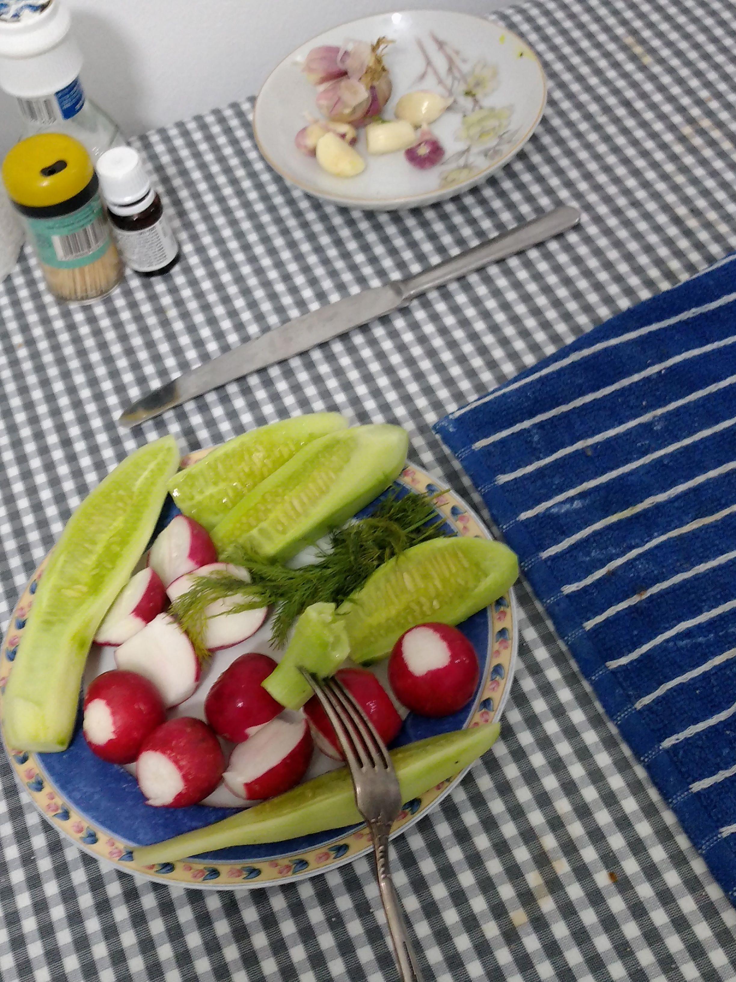 На столе в комнате уже ждут: рюмочка перцовки, молодой чеснок, салат из огурцов, редисочки и укропа и черный хлеб крупными ломтями.