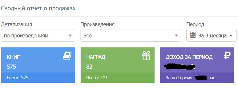 Итак, три месяца назад я получил коммерческий статус и сейчас на мой взгляд самое время подвести некоторые итоги по продажам. Учитывая, что ни в какую рекламу я не вкладывался и вообще никак не занимался продвижением своих книг, а еще к тому же то, что две из трёх продаваемых книг написаны уже довольно давно, результаты, на мой взгляд, получились довольно хорошие. Пятьсот семьдесят пять проданных книг и восемьдесят две награды.