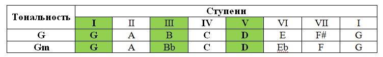 К устойчивым нотам относятся I, III и V ступени. Именно из них составляют основные аккорды тональности: G - GBD, Gm - GBbD.