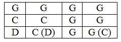 Перед нами схема классического блюзового квадрата, в котором первые четыре такта играются аккордами, построенными от тоники, пятый и шестой - от субдоминанты, девятый от доминанты, десятый - как от доминанты, так и от субдоминанты, двенадцатый - от тоники (если же мы идем на новый круг, то здесь применяется аккорд, построенный от субдоминанты, поскольку она является неустойчивой нотой).