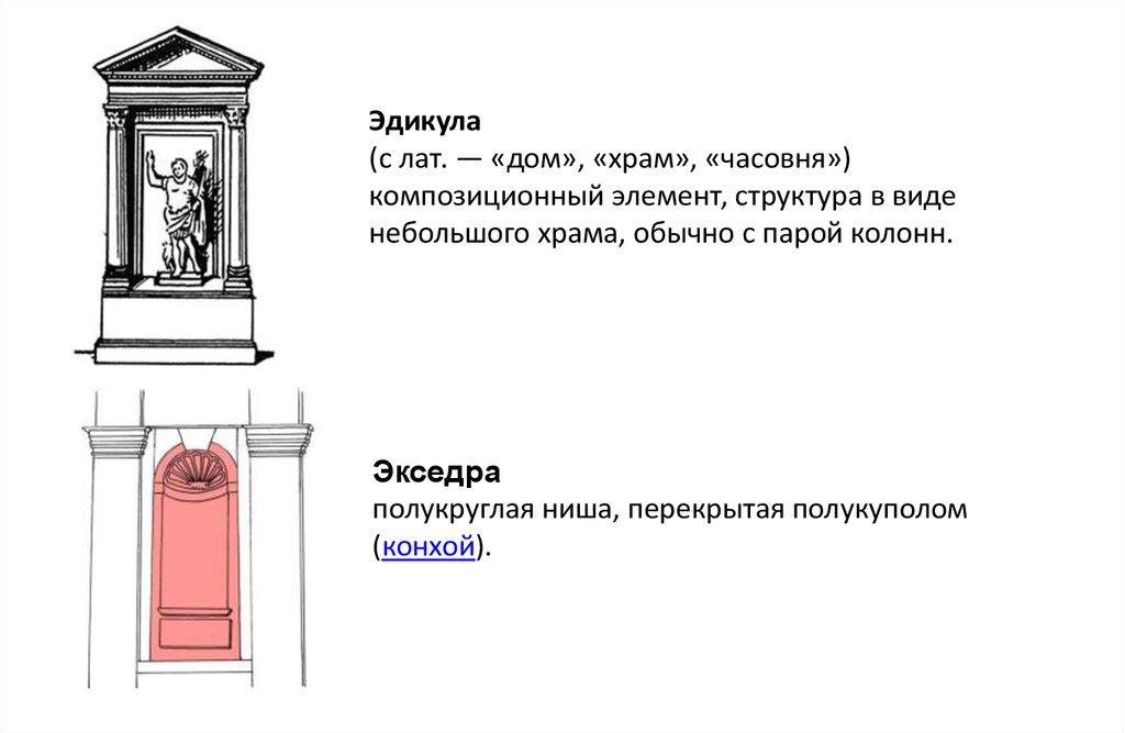 Эдикула и экседра — это небольшие элементы, как внутреннего, так и внешнего декора, которые повторяют основные элементы фасада. Обычно это ниша в стене или, наоборот, пристройка, прямоугольной или полукруглой формы, ограниченные парой колонн по бокам, фризом сверху и увенчанные мини-фронтоном или полукуполом. От них требуется избавиться в той же мере и можно тем же способом, каким были убраны «большие» ордерные элементы. На самом деле, большого толку от них нет, в основном это декоративные и/или культовые сооружения. В классицизме они нужны для заполнения большого пространства стен, чтобы те не казались пустыми. В ниши помещают зеркала, туалетные столики, вазы, кресла, иногда даже фонтаны. У мусульман есть похожий элемент — михраб (ниша в стене мечети), часто с двумя колоннами, но без фриза и античного декора. Обычно этого достаточно, чтобы элемент перестал быть ордерным.