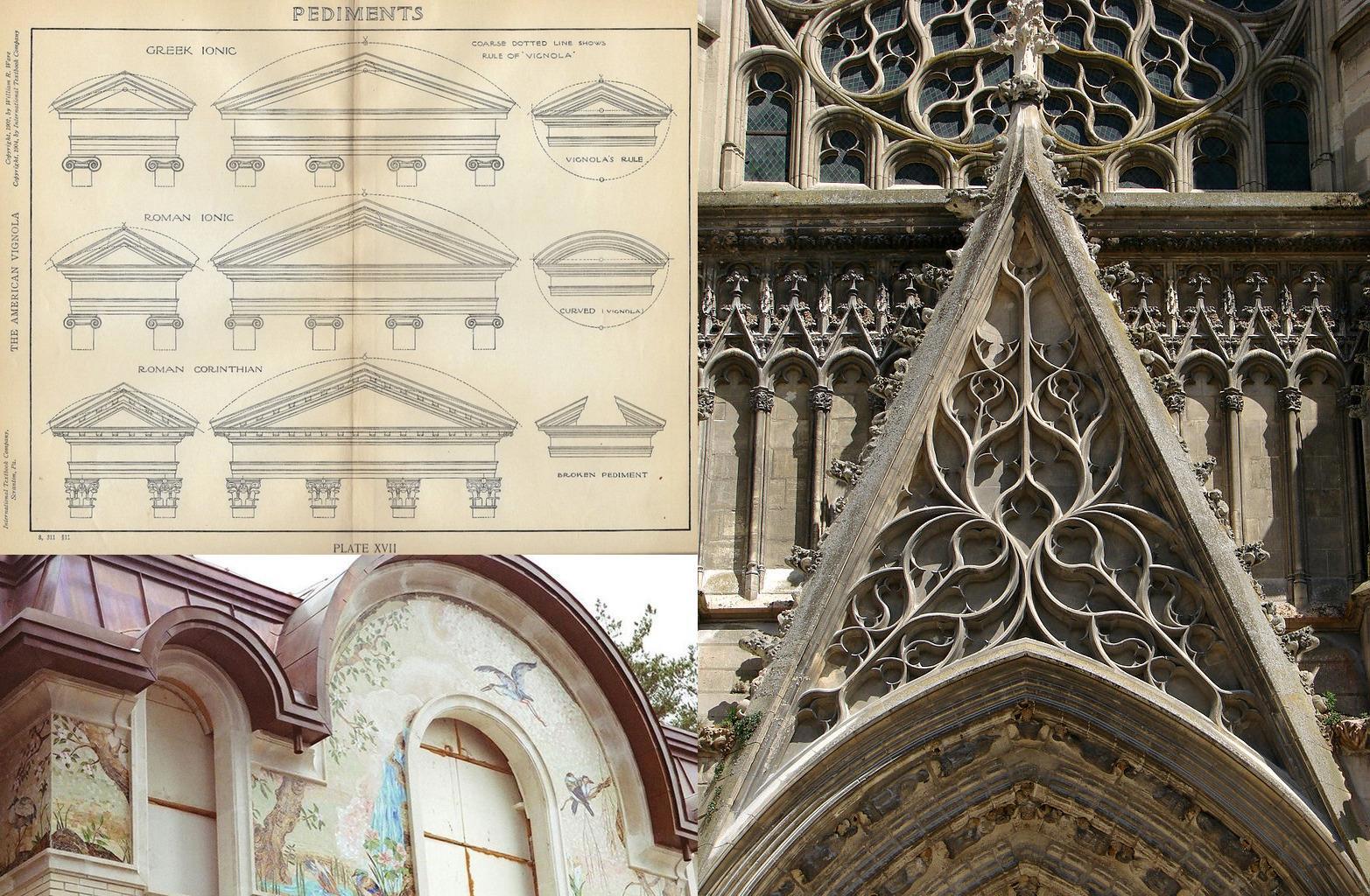 Фронтон — треугольное (или реже скругленное) пространство с двумя скатами, венчающее портик. Самый узнаваемый элемент всей античной архитектуры. В классицизме часто играет декоративную роль: мини-фронтоны украшают двери, окна, ниши и т.д. Используются как снаружи (большой, фасадный фронтон), так и внутри. Пространство внутри фронтона заполняется рельефами. В вариантах для бедных — ничем. Можно встретить в центре фронтона фигурное окно или круглые часы. Лучше всего его вообще убрать. Ну или хотя бы изменить форму. Классический фронтон имеет форму равнобедренного треугольника с очень тупым верхним углом. Если верхний угол острый, то это уже не классический, а готический элемент — вимперг (которого, впрочем, тоже стоит избегать ввиду его не меньше узнаваемости и культурно-географической привязки). Можно убрать фриз, фронтон без нижней перекладины — уже не ордерный элемент.