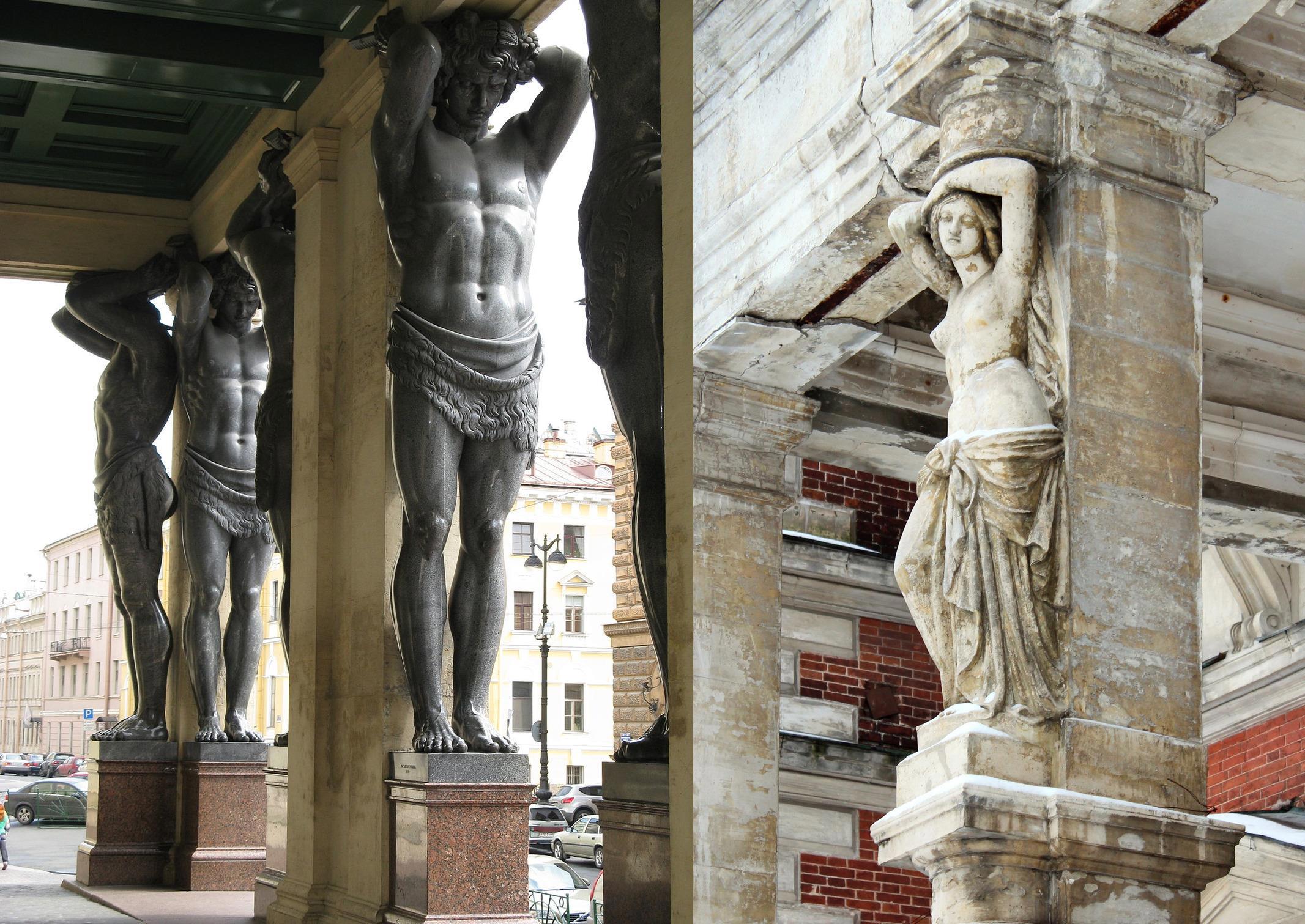 Кариатиды, канефоры и атланты — колонны в виде человеческих фигур. Наиболее характерны девушки в длинных одеждах и мускулистые полуобнаженные мужчины. Эти статуи сами по себе ярко отсылают к античности, поэтому их использовать нельзя. Но в самой идее опоры в виде фигуры ничего неповторимого нет. Смена позы и одежды оторвет этот элемент от античности, после чего его можно использовать в новом контексте.
