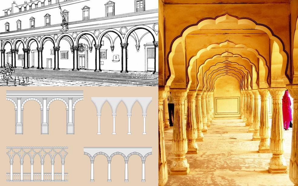 Аркада — последовательность из нескольких арок. Идущие вдоль (подобные стене) настолько сильно ассоциируются с Римом, что лучше их убрать. Изменение формы и размера ситуацию меняет незначительно. Но аркада, идущая вглубь (как коридор) уже ничего общего с античностью не имеет, можно смело использовать. Проще всего заменить стеной. Стена, даже с проемами — уже не аркада.