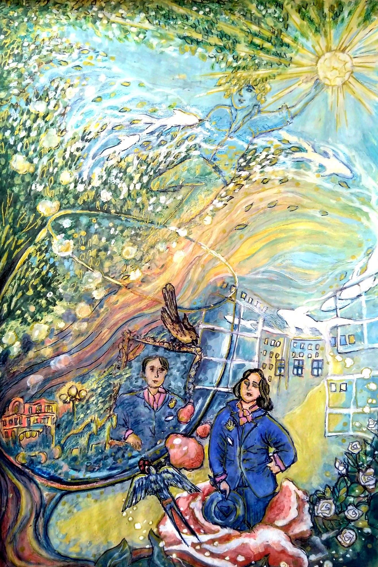 своё состояние хочу показать вам через стихотворение "Жёлтое марево плавит асфальт..." тем более, что моя бывшая ученица Олечка Сперанская, с которой мы дружим до сих пор (хотя она окончила гимназию уже лет двадцать назад) нарисовала новую иллюстрацию к этому моему давнему, но такому нынче актуальному стихотворению...